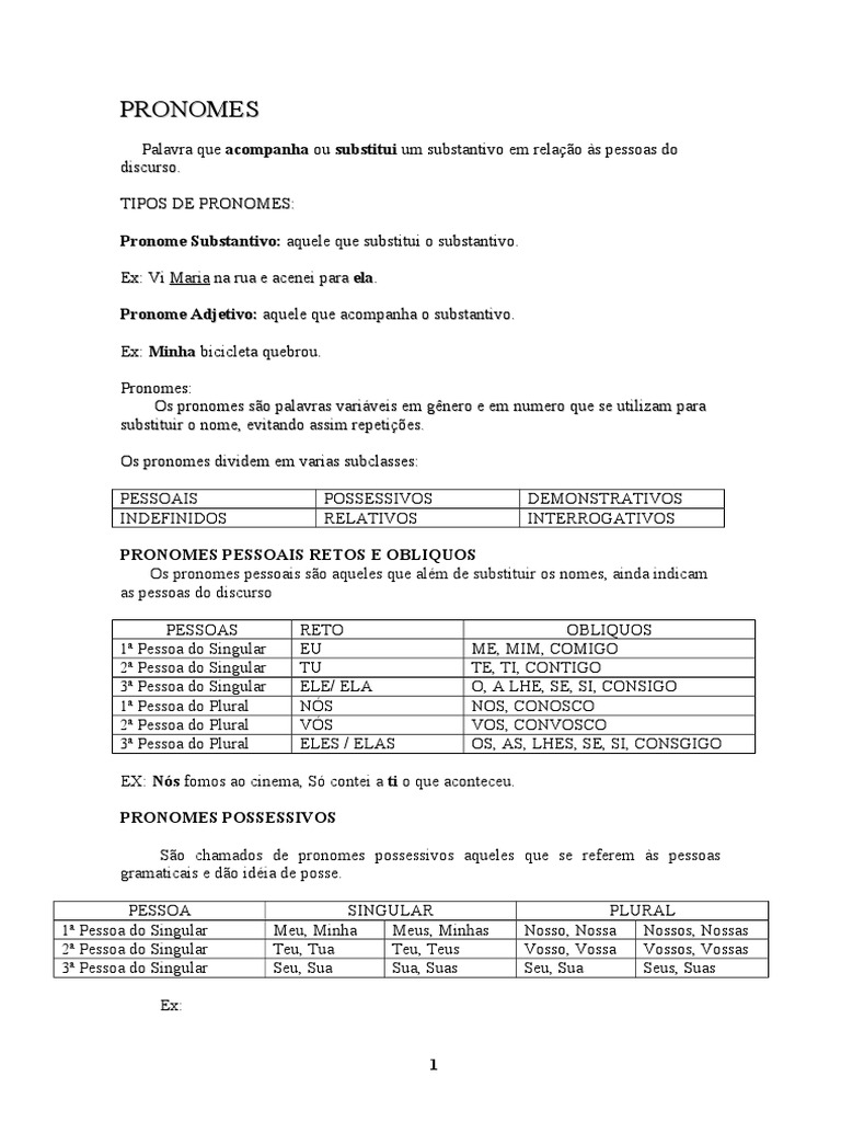 Palavra que acompanha ou substitui um substantivo em relao s pessoas do discurso. TIPOS E PRONOMES! Pronome Substantivo: aquele que substitui o substantivo. E"! #i Maria na rua e acenei para ela. Pronome Adjetivo: aquele que acompan$a o substantivo. E"! Minha bicicleta quebrou. Pronomes! Os pronomes so palavras vari%veis em &'nero e em numero que se utili(am para substituir o nome) evitando assim repeti*es. Os pronomes dividem em varias subclasses! PESSO+IS IN E,INI OS POSSESSI#OS RE-+TI#OS EMONSTR+TI#OS INTERRO.+TI#OS