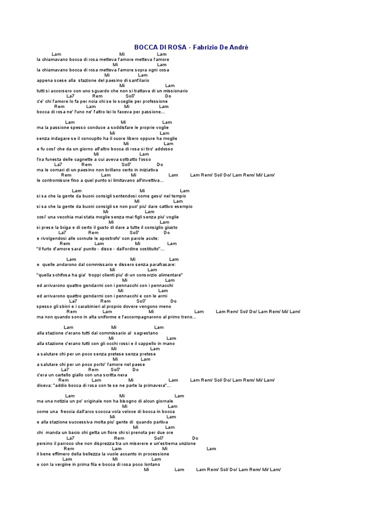Lam Mi Lam la chiamavano bocca di rosa metteva l'amore metteva l'amore Mi Lam la chiamavano bocca di rosa metteva l'amore sopra ogni cosa Mi Lam appena scese alla stazione del paesino di sant'ilario Mi Lam tutti si accorsero con uno sguardo che non si trattava di un missionario La7 Rem Sol7 Do c'e' chi l'amore lo fa per noia chi se lo sceglie per professione Rem Lam Mi Lam bocca di rosa ne' l'uno ne' l'altro lei lo faceva per passione... Lam Mi Lam ma la passione spesso conduce a soddisfare le proprie voglie Mi Lam senza indagare se il concupito ha il cuore libero oppure ha moglie Mi Lam e fu cosi' che da un giorno all'altro bocca di rosa si tiro' addosso Mi Lam l'ira funesta delle cagnette a cui aveva sottratto l'osso La7 Rem Sol7 Do ma le comari di un paesino non brillano certo in iniziativa Rem Lam Mi Lam le contromisure fino a quel punto si limitavano all'invettiva...