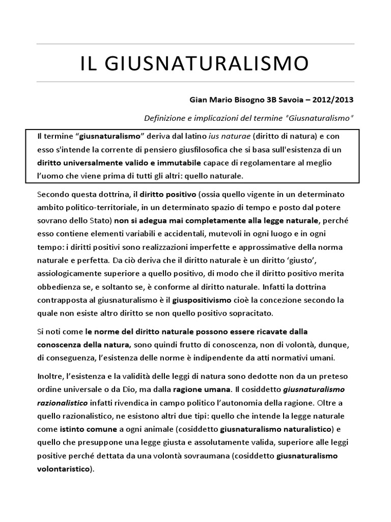 Gian Mario Bisogno 3B Savoia 2012/2013 Definizione e implicazioni del termine Giusnaturalismo Il termine giusnaturalismo deriva dal latino ius naturae (diritto di natura) e con esso s'intende la corrente di pensiero giusfilosofica che si basa sull'esistenza di un diritto universalmente valido e immutabile capace di regolamentare al meglio luomo che viene prima di tutti gli altri: quello naturale. Secondo questa dottrina, il diritto positivo (ossia quello vigente in un determinato ambito politico-territoriale, in un determinato spazio di tempo e posto dal potere sovrano dello Stato) non si adegua mai completamente alla legge naturale, perch esso contiene elementi variabili e accidentali, mutevoli in ogni luogo e in ogni tempo: i diritti positivi sono realizzazioni imperfette e approssimative della norma naturale e perfetta. Da ci deriva che il diritto naturale un diritto giusto, assiologicamente superiore a quello positivo, di modo che il diritto positivo merita obbedienza se, e soltanto se, conforme al diritto naturale. Infatti la dottrina contrapposta al giusnaturalismo il giuspositivismo cio la concezione secondo la quale non esiste altro diritto se non quello positivo sopracitato. Si noti come le norme del diritto naturale possono essere ricavate dalla conoscenza della natura, sono quindi frutto di conoscenza, non di volont, dunque, di conseguenza, lesistenza delle norme indipendente da atti normativi umani. Inoltre, lesistenza e la validit delle leggi di natura sono dedotte non da un preteso ordine universale o da Dio, ma dalla ragione umana. Il cosiddetto giusnaturalismo razionalistico infatti rivendica in campo politico lautonomia della ragione. Oltre a quello razionalistico, ne esistono altri due tipi: quello che intende la legge naturale come istinto comune a ogni animale (cosiddetto giusnaturalismo naturalistico) e quello che presuppone una legge giusta e assolutamente valida, superiore alle leggi positive perch dettata da una volont sovraumana (cosiddetto giusnaturalismo volontaristico).