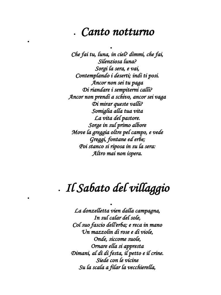 Che fai tu, luna, in ciel? dimmi, che fai, Silenziosa luna? Sorgi la sera, e vai, Contemplando i deserti; indi ti posi. Ancor non sei tu paga Di riandare i sempiterni calli? Ancor non prendi a schivo, ancor sei vaga Di mirar queste valli? Somiglia alla tua vita La vita del pastore. Sorge in sul primo albore Move la greggia oltre pel campo, e vede Greggi, fontane ed erbe; Poi stanco si riposa in su la sera: Altro mai non ispera.