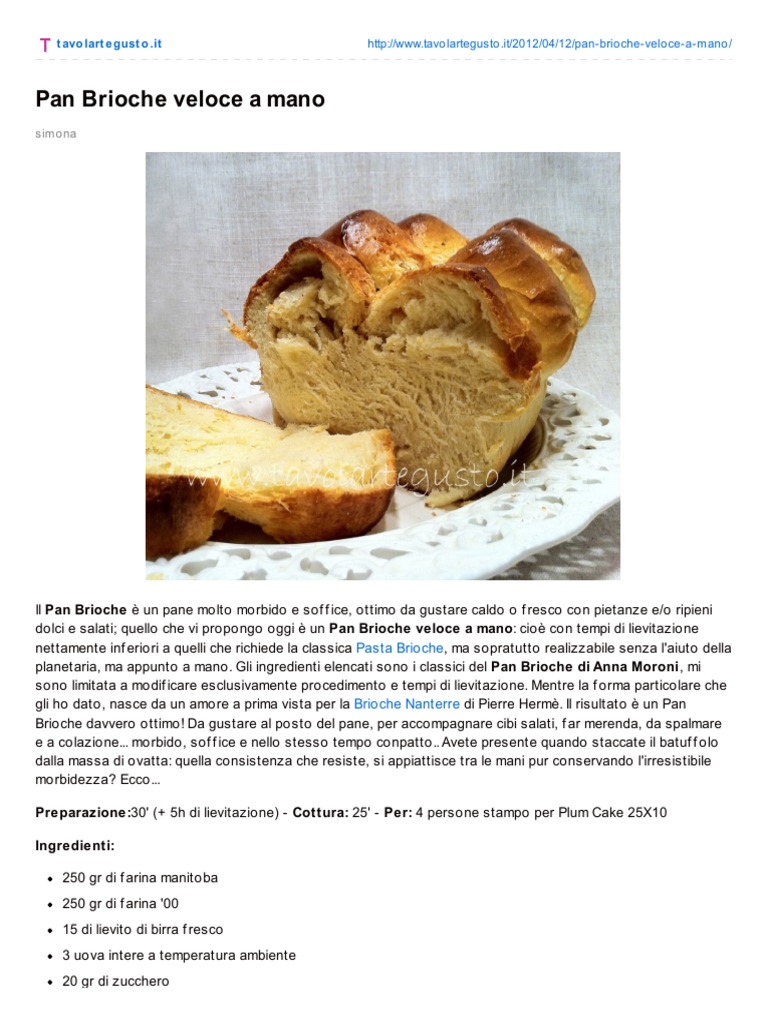 Il Pan Brioche un pane molto morbido e sof f ice, ottimo da gustare caldo o f resco con pietanze e/o ripieni dolci e salati; quello che vi propongo oggi un Pan Brioche veloce a mano : cio con tempi di lievitazione nettamente inf eriori a quelli che richiede la classica Pasta Brioche, ma sopratutto realizzabile senza l'aiuto della planetaria, ma appunto a mano. Gli ingredienti elencati sono i classici del Pan Brioche di Anna Moroni , mi sono limitata a modif icare esclusivamente procedimento e tempi di lievitazione. Mentre la f orma particolare che gli ho dato, nasce da un amore a prima vista per la Brioche Nanterre di Pierre Herm. Il risultato un Pan Brioche davvero ottimo! Da gustare al posto del pane, per accompagnare cibi salati, f ar merenda, da spalmare e a colazione... morbido, sof f ice e nello stesso tempo conpatto.. Avete presente quando staccate il batuf f olo dalla massa di ovatta: quella consistenza che resiste, si appiattisce tra le mani pur conservando l'irresistibile morbidezza? Ecco... Preparazione:30' (+ 5h di lievitazione) - Cottura: 25' - Per: 4 persone stampo per Plum Cake 25X10 Ingredienti: 250 gr di f arina manitoba 250 gr di f arina '00 15 di lievito di birra f resco 3 uova intere a temperatura ambiente 20 gr di zucchero