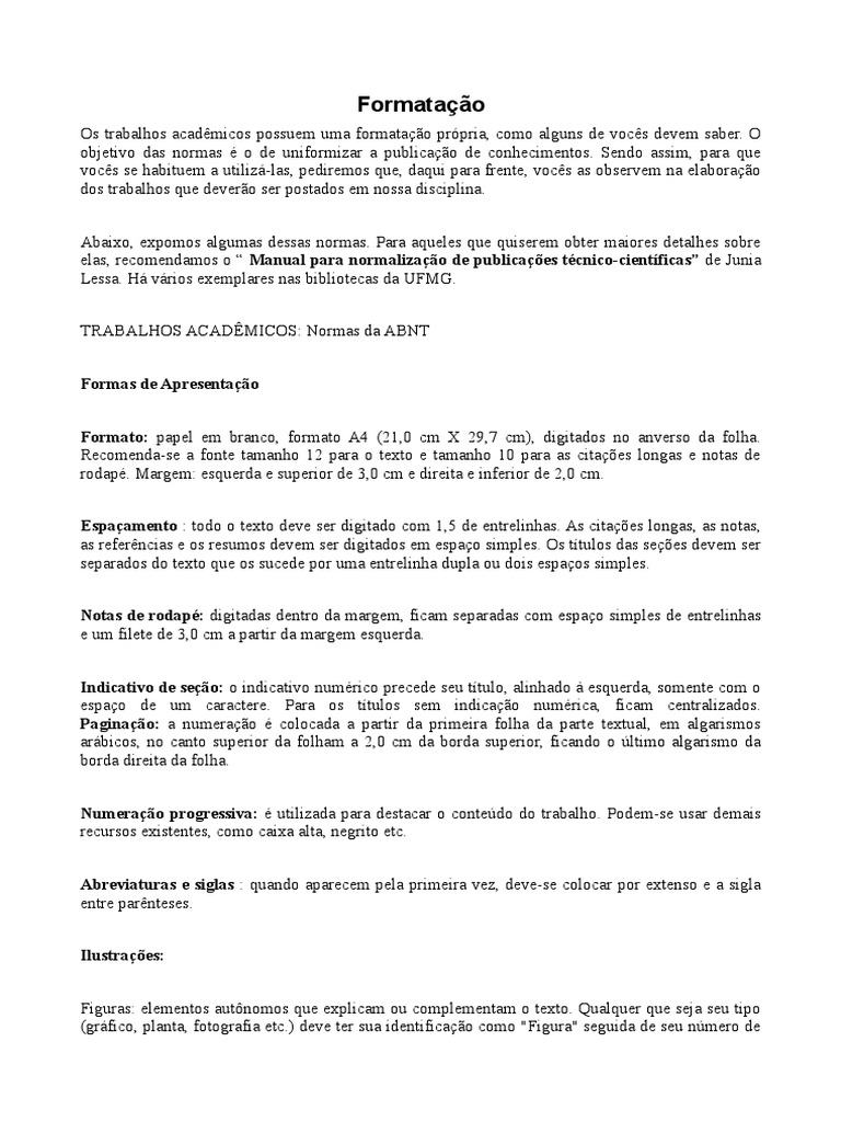 Os trabalhos acadmicos possuem uma formatao prpria, como alguns de vocs devem saber. O objetivo das normas o de uniformizar a publicao de conhecimentos. Sendo assim, para ue vocs se habituem a utiliz!"las, pediremos ue, da ui para frente, vocs as observem na elaborao dos trabalhos ue devero ser postados em nossa disciplina. #bai$o, e$pomos algumas dessas normas. %ara a ueles ue uiserem obter maiores detalhes sobre elas, recomendamos o & Manual para normalizao de publicaes tcnico-cientficas de 'unia (essa. )! v!rios e$emplares nas bibliotecas da *+,-. ./#0#()OS #1#23,41OS5 6ormas da #06. Formas de Apresentao Formato: papel em branco, formato #7 89:,; cm < 9=,> cm?, digitados no anverso da folha. /ecomenda"se a fonte tamanho :9 para o te$to e tamanho :; para as cita@es longas e notas de rodap. ,argem5 es uerda e superior de A,; cm e direita e inferior de 9,; cm. Espaamento 5 todo o te$to deve ser digitado com :,B de entrelinhas. #s cita@es longas, as notas, as referncias e os resumos devem ser digitados em espao simples. Os tCtulos das se@es devem ser separados do te$to ue os sucede por uma entrelinha dupla ou dois espaos simples. Notas de rodap: digitadas dentro da margem, ficam separadas com espao simples de entrelinhas e um filete de A,; cm a partir da margem es uerda. ndicati!o de seo: o indicativo numrico precede seu tCtulo, alinhado D es uerda, somente com o espao de um caractere. %ara os tCtulos sem indicao numrica, ficam centralizados. "a#inao: a numerao colocada a partir da primeira folha da parte te$tual, em algarismos ar!bicos, no canto superior da folham a 9,; cm da borda superior, ficando o Eltimo algarismo da borda direita da folha. Numerao pro#ressi!a: utilizada para destacar o conteEdo do trabalho. %odem"se usar demais recursos e$istentes, como cai$a alta, negrito etc. Abre!iaturas e si#las 5 uando aparecem pela primeira vez, deve"se colocar por e$tenso e a sigla entre parnteses. lustraes: +iguras5 elementos autFnomos ue e$plicam ou complementam o te$to. Gual uer ue seja seu tipo 8gr!fico, planta, fotografia etc.? deve ter sua identificao como H+iguraH seguida de seu nEmero de