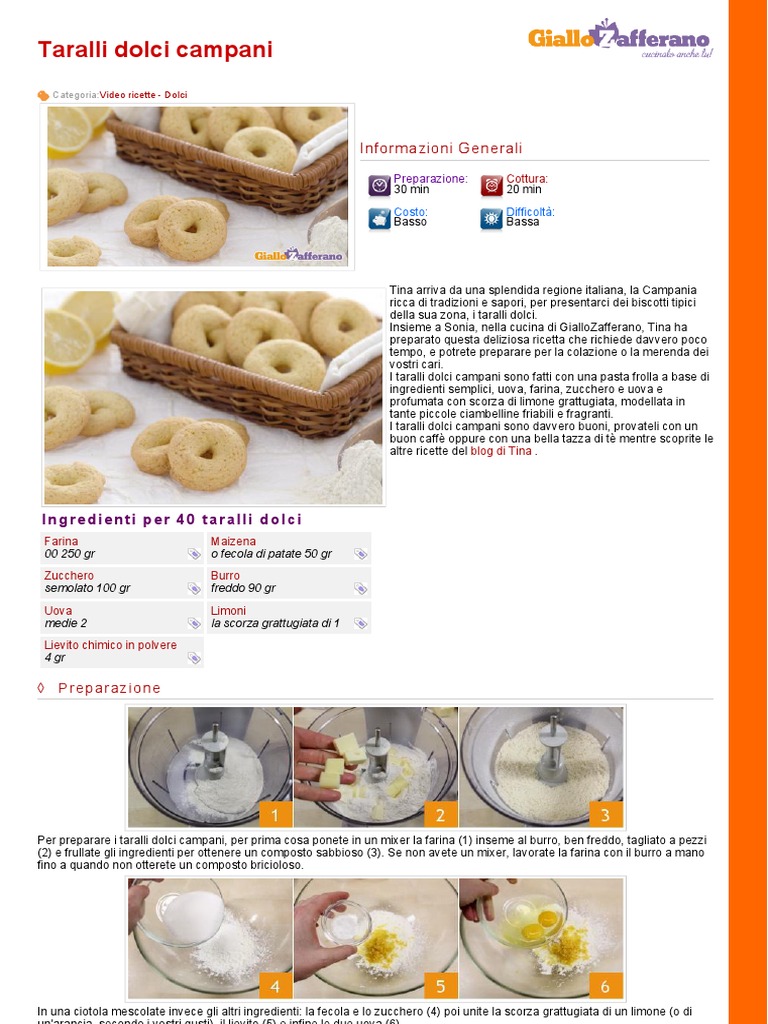 Tina arriva da una splendida regione italiana, la Campania ricca di tradizioni e sapori, per presentarci dei biscotti tipici della sua zona, i taralli dolci. Insieme a Sonia, nella cucina di GialloZafferano, Tina ha preparato questa deliziosa ricetta che richiede davvero poco tempo, e potrete preparare per la colazione o la merenda dei vostri cari. I taralli dolci campani sono fatti con una pasta frolla a base di ingredienti semplici, uova, farina, zucchero e uova e profumata con scorza di limone grattugiata, modellata in tante piccole ciambelline friabili e fragranti. I taralli dolci campani sono davvero buoni, provateli con un buon caff oppure con una bella tazza di t mentre scoprite le altre ricette del blog di Tina .