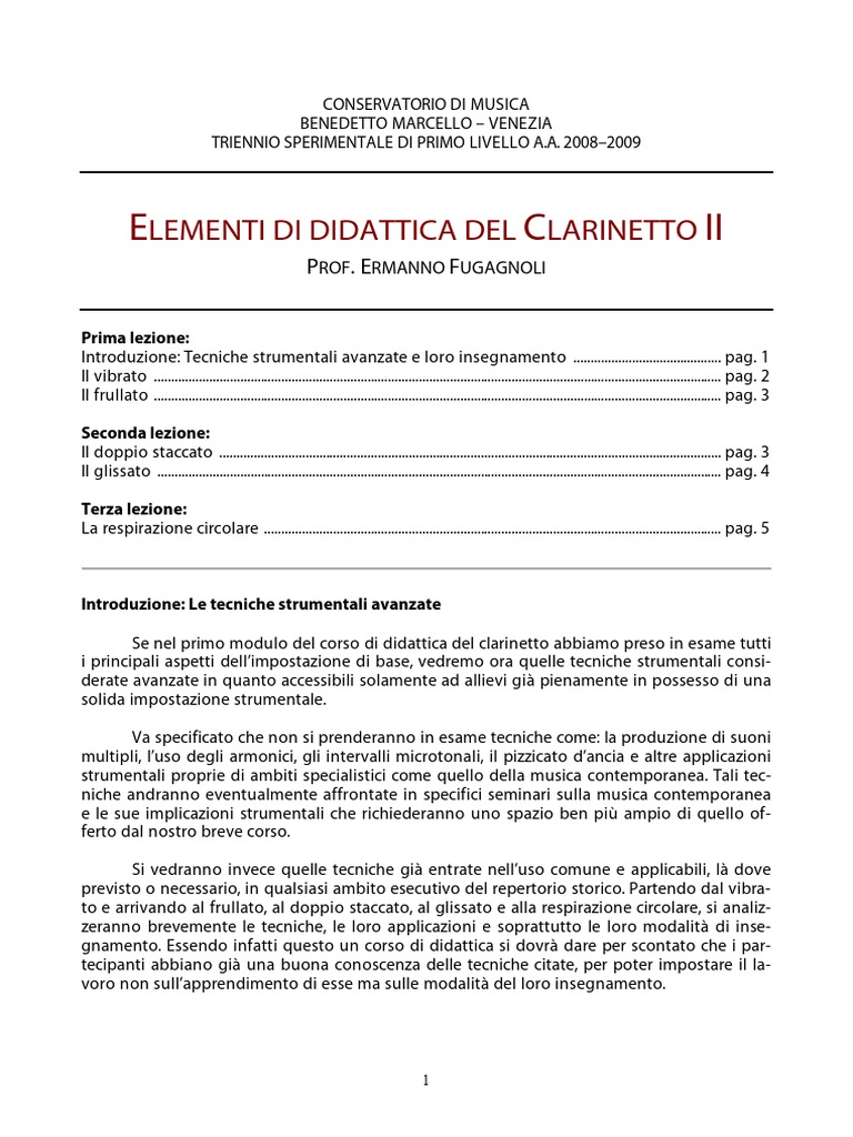 Prima lezione: Introduzione: Tecniche strumentali avanzate e loro insegnamento ........................................... pag. 1 Il vibrato ..................................................................................................................................................................... pag. 2 Il frullato ..................................................................................................................................................................... pag. 3 Seconda lezione: Il doppio staccato .................................................................................................................................................. pag. 3 Il glissato .................................................................................................................................................................... pag. 4 Terza lezione: La respirazione circolare ..................................................................................................................................... pag. 5