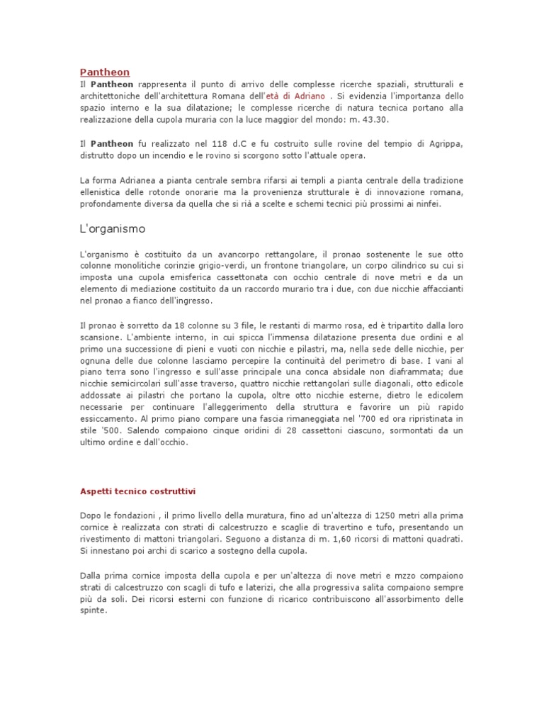 Il Pantheon rappresenta il punto di arrivo delle complesse ricerche spaziali, strutturali e architettoniche dell'architettura Romana dell'et di Adriano . Si evidenzia l'importanza dello spazio interno e la sua dilatazione; le complesse ricerche di natura tecnica portano alla realizzazione della cupola muraria con la luce maggior del mondo: m. 43.3 . Il Pantheon !u realizzato nel ""# d.$ e !u costruito sulle rovine del tempio di Agrippa, distrutto dopo un incendio e le rovino si scorgono sotto l'attuale opera. %a !orma Adrianea a pianta centrale sem&ra ri!arsi ai templi a pianta centrale della tradizione ellenistica delle rotonde onorarie ma la provenienza strutturale ' di innovazione romana, pro!ondamente diversa da (uella che si ri a scelte e schemi tecnici pi) prossimi ai nin!ei.