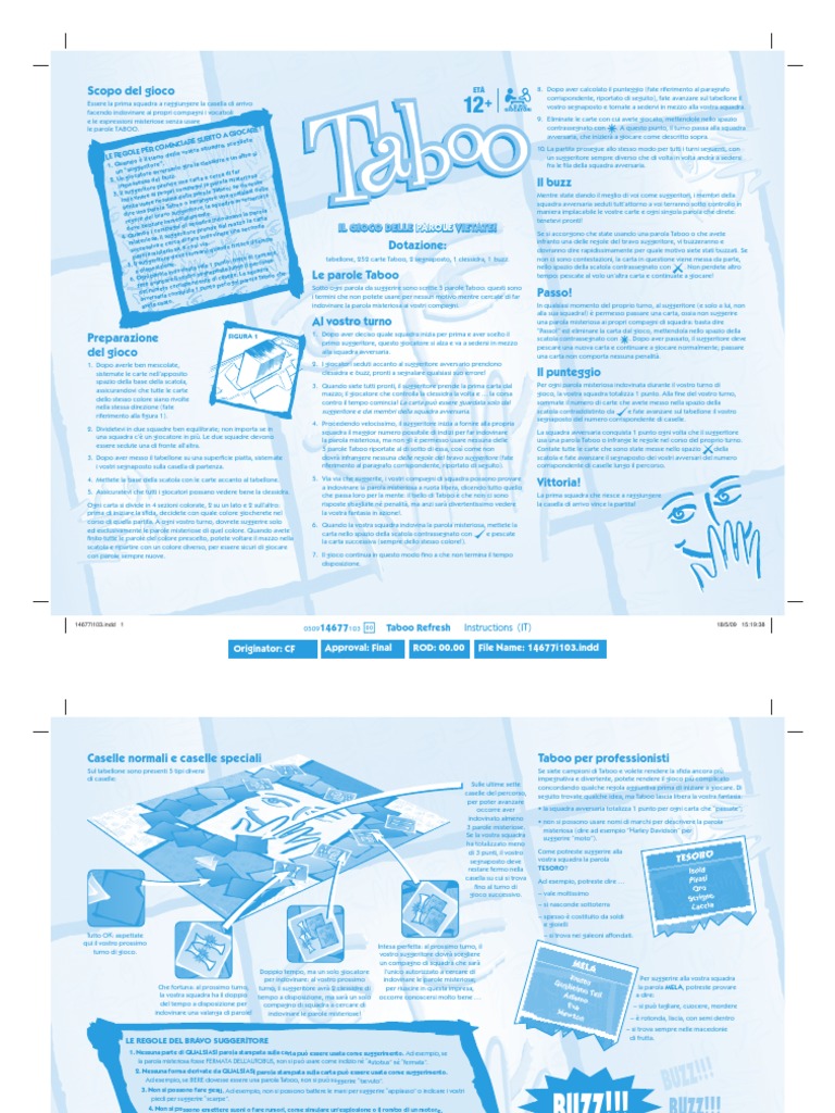 ss nd 1. Qua uggeritore. ario gira la cle un s avvers i far re to a . c z cerca d io z osa 2. Un g sessa del bu e una carta e arola misteri sse s p d o n ove la i re d imp n p e g s a re ; p o gerito Tabo i delle ri com 3. Il sug inare ai prop delle parole una qualsias ria lo indov are nessuna o infrangere dra avversa s a senza u parola Taboo ritore, la squ e la a la paro dire un el bravo sugg tamente. vinano a d regole zzare immedia squadra indo mazzo la cart i l u deve b i compagni d re prende da una seconda rito are ndo 4. Qua riosa, il sugge i fare indovin d tempo miste e cerca e cos via. nisce il a iv s s e n , a do a s u succ o q i ri rs te a rm mis rle, parola tore deve fe di conta o : nito geri 1 punto ngo il percors 5. Il sug osizione. le a v ta lu a a disp indovin segnaposto e. La squadra o che la ro a ll ro p o 6. Ogni vanzare il vost dente di case ni parola Tab ispon unto per og fate a p ero corr del num a conquista 1 ri avversa to. sa u avete