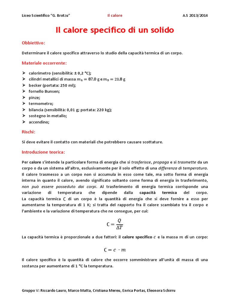 Grazie alla capacit termica di ognuno dei due cilindri, siamo in grado di calcolare il loro calore specifico: