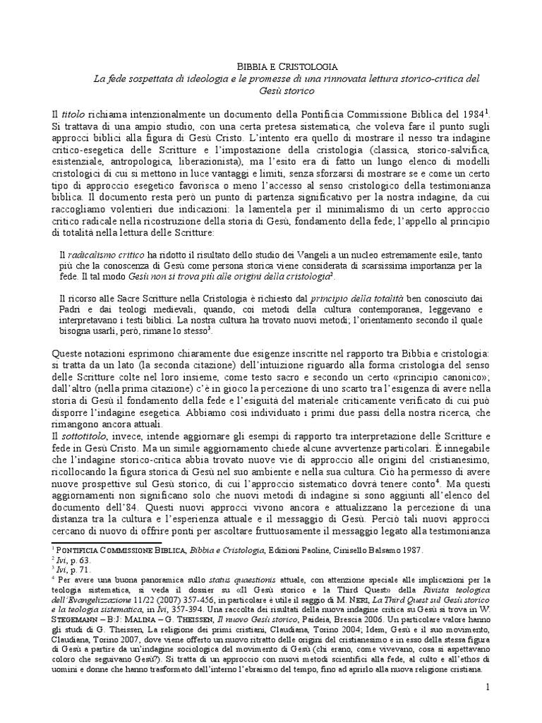 intenzionalmente un documento della Pontificia Commissione Biblica del 1 !"1# Si tratta$a di una am%io studio& con una certa %retesa sistematica& che $ole$a fare il %unto su'li a%%rocci biblici alla fi'ura di Ges( Cristo# L)intento era *uello di mostrare il nesso tra inda'ine critico+ese'etica delle Scritture e l)im%ostazione della cristolo'ia ,classica& storico+sal$ifica& esistenziale& antro%olo'ica& liberazionista-& ma l)esito era di fatto un lun'o elenco di modelli cristolo'ici di cui si mettono in luce $anta''i e limiti& senza sforzarsi di mostrare se e come un certo ti%o di a%%roccio ese'etico fa$orisca o meno l)accesso al senso cristolo'ico della testimonianza biblica# Il documento resta %er. un %unto di %artenza si'nificati$o %er la nostra inda'ine& da cui racco'liamo $olentieri due indicazioni/ la lamentela %er il minimalismo di un certo a%%roccio critico radicale nella ricostruzione della storia di Ges(& fondamento della fede0 l)a%%ello al %rinci%io di totalit1 nella lettura delle Scritture/