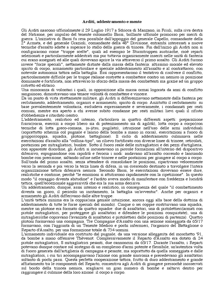 del Natisone, per impulso del tenente colonnello Bassi, brillante ufficiale promosso per meriti di guerra. L'iniziativa di Bassi fu resa possibile dall'appoggio del generale Capello, comandante della 2 Armata, e del generale Grazioli, comandante della 48 Divisione, entrambi interessati a nuove tecniche d'assalto adatte a superare lo stallo della guerra di trincea. Fin dall'inizio gli Arditi non si configurarono come "truppe scelte", quali ad esempio le Sturmtruppen austriache, cio reparti selezionati e particolarmente addestrati ma pur tuttavia organicamente inseriti nelle unit di fanteria cui erano assegnati ed alle quali dovevano aprire la via attraverso il primo assalto. Gli Arditi furono invece "forze speciali", nettamente distinte dalla massa della fanteria: altissimo morale ed elevato spirito di corpo, armamento particolare e speciale addestramento all'assalto e al contrattacco, con notevole autonomia tattica nella battaglia. Essi rappresentarono il tentativo di risolvere il conflitto, particolarmente difficile per le truppe italiane costrette a combattere contro un nemico in posizione dominante e fortificata, non attraverso lo sforzo della massa dei combattenti ma grazie ad un gruppo ristretto ed elitario. Una minoranza di volontari i quali, in opposizione alla massa ormai logorata da anni di conflitto sanguinoso, dimostravano una tenace volont di combattere e vincere. Da un punto di vista strettamente militare, gli Arditi si differenziavano nettamente dalla fanteria per reclutamento, addestramento, organici e armamento, spirito di corpo. Anzitutto il reclutamento: su base prevalentemente volontaria, escludeva espressamente e severamente, i condannati per reati comuni, mentre era aperto a chi avesse subito condanne per reati militari lievi quali il rifiuto d'obbedienza e ritardato rientro. L'addestramento, realistico ed intenso, s'articolava in quattro differenti aspetti: preparazione fisica(corsa, esercizi a corpo libero sia di potenziamento sia di agilit), lotta corpo a corpo(con tecniche di lotta greco-romana, ju-jitsu, pugilato), istruzione nell'uso delle armi individuali (soprattutto scherma col pugnale e lancio della bomba a mano in corsa), esercitazioni a fuoco di gruppo(coppia, squadra, plotone, battaglione). Il ciclo di addestramento culminava nelle esercitazioni d'assalto alla "collina-tipo", un rilievo fortificato con diverse linee di trincee, reticolati, postazioni per mitragliatrici, bunker. Sotto il fuoco reale delle mitragliatrici e dei pezzi d'artiglieria, con apparente disordine, gli Arditi si incuneavano in piccole formazioni all'interno del dispositivo difensivo, espugnandone con rapidit e ferocia i nodi: andavano all'assalto correndo e lanciando bombe con precisione, saltando infine nelle trincee e nelle postazioni per giungere al corpo a corpo. Sull'onda del primo assalto, senza attendere di consolidare le posizioni, ripartivano velocemente verso la seconda e poi verso la terza linea di difesa, in un crescendo destinato a travolgere l'intera organizzazione tattica difensiva nemica. Secondo Bassi, le esercitazioni dovevano essere dure, realistiche e continue, perch "le emozioni si attutiscono rapidamente con la ripetizione". In questo modo "il coraggio diventa abitudine" e l'ardito aveva modo di manifestare con freddezza e lucidit tattica, quell'eccezionale aggressivit che era la sua arma decisiva. Un addestramento, dunque, assai intenso e realistico, in conseguenza del quale "il combattimento diventa un gioco, il pericolo un incitamento, la battaglia un'avventur". Anche per organici e armamento gli Arditi differivano dalle altre truppe. L'unit tattica minima era la coppia(una geniale intuizione, ancora oggi alla base della dottrina di addestramento di tutte le forse speciali del mondo). Cinque o sei coppie costituivano una squadra, mentre un plotone era formato da quattro squadre: due di assaltatori, una di pistolettieri(armati con pistole mitragliatrici, per proteggere gli assaltatori e difendere le posizioni conquistate), una di mitraglieri(che copravano l'avanzata di assaltatori e pistolettieri dalle posizioni di partenza). Quattro plotoni formavano una compagnia. Tre Compagnie d'Assalto con una sezione someggiata da 65/17 formavano, con l'aggiunta di un Tenente Medico e pochi infermieri, l'organico del Battaglione o Reparto d'Assalto, per una formazione totale di 734 uomini. L'armamento individuale era costituito dal pugnale, da una versione alleggerita del moschetto '91, da bombe a mano offensive Thvenot. Complessivamente il Reparto d'Assalto era dotato di 24 pistole mitragliatrici, 8 mitragliatrici pesanti, due cannoncini da 65/17. Durante l'assalto, i Reparti potevano dunque contare sul sostegno di un complesso d'armi potente e flessibile, un'autentica volta di fuoco generata dall'artiglieria di campagna e pesante, ma soprattutto da quella someggiata e dalle mitragliatrici, i cui tiri accompagnavano l'azione con grande sincronia e precedevano gli assaltatori soltanto di pochi passi. Questa perfetta cooperazione tattica, frutto di duro addestramento e grande affiatamento tra le componenti del Reparto, consentiva agli Arditi di giungere pressoch inosservati sul bordo della trincea nemica, scagliarvi un gran numero di bombe e saltarvi dentro per raggiungere il culmine della loro azione: il corpo a corpo.