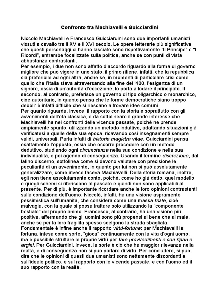 il XV e il XVI secolo. Le opere letterarie pi significative che questi personaggi ci hanno lasciato sono rispettivamente Il !rincipe" e I #icordi"$ entram%e focali&&ate sulla politica$ anche se con punti di vista a%%astan&a contrastanti. !er esempio$ i due non sono affatto d'accordo riguardo alla forma di governo migliore che pu vigere in uno stato( il primo ritiene$ infatti$ che la repu%%lica sia preferi%ile ad ogni altra$ anche se$ in momenti di particolare crisi come quello che l'Italia stava attraversando alla fine del )*++$ l'esigen&a di un signore$ ossia di un'autorit, d'ecce&ione$ lo porta a lodare il principato. Il secondo$ al contrario$ preferisce un governo di tipo oligarchico o monarchico$ cio- autoritario$ in quanto pensa che le forme democratiche siano troppo de%oli( - infatti difficile che si riescano a trovare idee comuni. !er quanto riguarda$ invece$ il rapporto con la storia e soprattutto con gli avvenimenti dell'et, classica$ - da sottolineare il grande interesse che Machiavelli ha nei confronti delle vicende passate$ poich. ne prende ampiamente spunto$ utili&&ando un metodo induttivo$ adattando situa&ioni gi, verificatesi a quelle della sua epoca$ ricavando cos/ insegnamenti sempre validi$ universali. !arla infatti di historia magistra vitae. Guicciardini pensa esattamente l'opposto$ ossia che occorre procedere con un metodo deduttivo$ studiando ogni circunstanza nella sua condi&ione e nella sua individualit,$ e poi agendo di conseguen&a. 0sando il termine discrezione$ dal latino discerno$ sottolinea come si devono valutare con precisione le peculiarit, di un avvenimento$ in quanto per lui non si pu assolutamente generali&&are$ come invece faceva Machiavelli. 1ella storia romana$ inoltre$ egli non tiene assolutamente conto$ poich.$ come ho gi, detto$ quel modello e quegli schemi si riferiscono al passato e quindi non sono applica%ili al presente. !er di pi$ - importante ricordare anche le loro opinioni contrastanti sulla condi&ione dell'uomo. Niccol$ infatti$ ha una visione aspramente pessimistica sull'umanit,$ che considera come una massa triste$ ciomalvagia$ con la quale si possa trattare solo utili&&ando la componente %estiale" del proprio animo. Francesco$ al contrario$ ha una visione pi positiva$ affermando che gli uomini sono pi propensi al %ene che al male$ anche se per la loro fragilit, spesso scelgono la strada s%agliata. Fondamentale - infine anche il rapporto virt-fortuna( per Machiavelli la fortuna$ intesa come sorte$ gioca" continuamente con la vita d'ogni uomo$ ma - possi%ile sfruttare le proprie virt per fare provvedimenti e con ripari e argini. !er Guicciardini$ invece$ la sorte - ci che ha maggior rilevan&a nella realt,$ e di conseguen&a non si pu parlare di virt. !er concludere$ si pu dire che le opinioni di questi due umanisti sono nettamente discordanti e sull'ideale politico$ e sul rapporto con le vicende passate$ e con l'uomo ed il suo rapporto con la realt,.