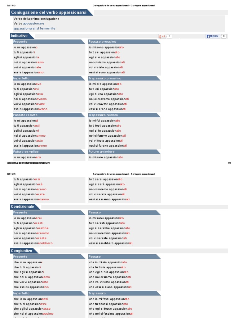 Passato prossimo io mi sono appassionato tu ti sei appassionato egli si appassionato noi ci siamo appassionati voi vi siete appassionati essi si sono appassionati Trapassato prossimo io mi ero appassionato tu ti eri appassionato egli si era appassionato noi ci eravamo appassionati voi vi eravate appassionati essi si erano appassionati Trapassato remoto io mi fui appassionato tu ti fosti appassionato egli si fu appassionato noi ci fummo appassionati voi vi foste appassionati essi si furono appassionati Futuro anteriore io mi sar appassionato