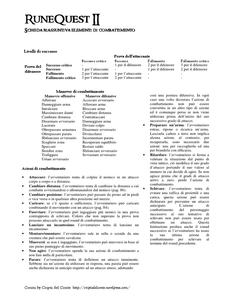 Successo critico Successo Fallimento Fallimento critico Successo critico 1 per lattaccante 2 per lattaccante 3 per lattaccante Successo 1 per il difensore 1 per lattaccante 2 per lattaccante Fallimento 2 per il difensore 1 per il difensore Fallimento critico 3 per il difensore 2 per il difensore -