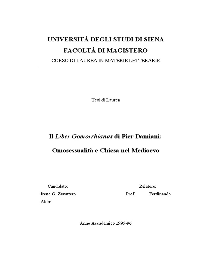 Nirenberg, D., Communities of Violence. Persecution of Minorities in the Middle Ages, Princeton 1996. Palazzini, P., Pier Damiani, in Bibliotheca Sanctorum, X, Roma 1968 (rist. 1982), p. 554-574. Palazzini, P., Pier Damiani, in Enciclopedia Cattolica, IX, Citt del Vaticano 1952, coll. 1377-1380. Payer, P., Penance and Penitentials, in Dictionary of the Middle Ages, IX, New York 1987, pp. 487-493. Payer, P., Sex and the Penitentials. The Development of Sexual Code 550-1150, Toronto 1984. Peterson, W. L., Can ARSENOKOITAI Be Translated by Homosexuals? [1Co 6,9, 1Tm 1,10], Vigiliae Christianae 40 (1986). Piana, G., Peccati e penitenza nel Medioevo, in A pane e acqua. Peccati e penitenze nel Medioevo. Il penitenziale di Burcardo di Worms, a cura di [Link] / [Link] / [Link], Novara 1986, pp. 7-40. Picasso, G. / G. Piana / G. Motta, A pane e acqua. Peccati e penitenze nel Medioevo. Il penitenziale di Burcardo di Worms, Novara 1986. Rattray Taylor, G., Sex in History, New York 1954. Reindel, K., Die Briefe des Petrus Damiani, I-IV, Mnchen 1983-1993 (MGH, Epistolae, II: Die Briefe der deutschen Kaiserzeit, I-IV). Reindel, K., Petrus Damiani und seine Korrespondenten, Studi Gregoriani 10 (1975), pp. 203-219. Reindel, K., Studien zur berlieferung der Werke des Petrus Damiani, Deutsches Archiv fr Erforschung des Mittelalters 15 (1959), pp. 23102; 16 (1960), pp. 73-154 e 18 (1962), pp. 317-417. Reindel, K., Zur handschriftlichen berlieferung der Gedichte des Petrus Damiani, Revue Bndictine 67 (1957), pp. 182-189. Reynolds, R.E. / S. Chodorow, Law, Canon in Dictionary of the Middle Ages, VII, New York 1986, pp. 395-418.