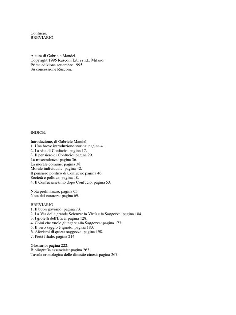 INDICE. Introduzione, di Gabriele Mandel. 1. Una breve introduzione storica: pagina 4. 2. La vita di Confucio: pagina 17. 3. Il pensiero di Confucio: pagina 29. La trascendenza: pagina 36. La morale comune: pagina 38. Morale individuale: pagina 42. Il pensiero politico di Confucio: pagina 46. Societ e politica: pagina 48. 4. Il Confucianesimo dopo Confucio: pagina 53. Nota preliminare: pagina 65. Nota del curatore: pagina 69. BREVIARIO. 1. Il buon governo: pagina 73. 2. La Via della grande Scienza: la Virt e la Saggezza: pagina 104. 3. I gioielli dell'Etica: pagina 128. 4. Colui che vuole giungere alla Saggezza: pagina 173. 5. Il vero saggio ignoto: pagina 183. 6. Aforismi di quieta saggezza: pagina 198. 7. Piet filiale: pagina 214. Glossario: pagina 222. Bibliografia essenziale: pagina 263. Tavola cronologica delle dinastie cinesi: pagina 267.