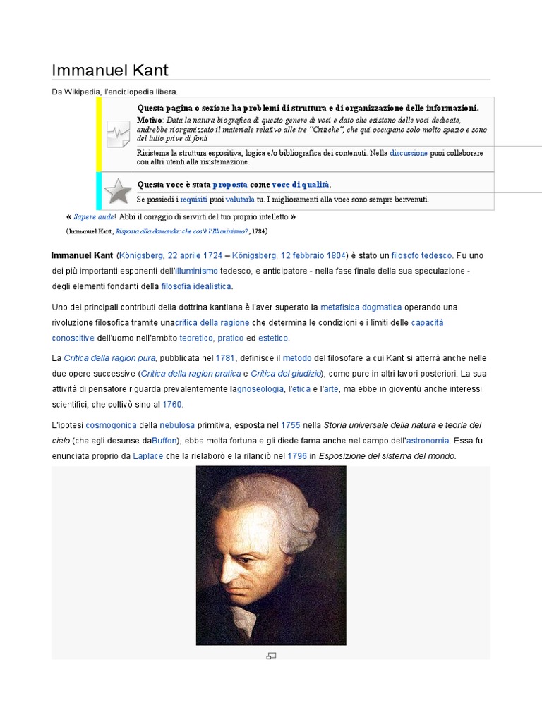 dei pi' importanti esponenti dell'illuminismo tedesco, e anticipatore ( nella !ase !inale della sua specula)ione ( degli elementi !ondanti della !iloso!ia idealistica. *no dei principali contributi della dottrina kantiana % l'a+er superato la meta!isica dogmatica operando una ri+olu)ione !iloso!ica tramite unacritica della ragione c,e determina le condi)ioni e i limiti delle capacitconosciti+e dell'uomo nell'ambito teoretico, pratico ed estetico. .a Critica della ragion pura, pubblicata nel 17"1, de!inisce il metodo del !iloso!are a cui Kant si atterr- anc,e nelle due opere successi+e (Critica della ragion pratica e Critica del giudizio$, come pure in altri la+ori posteriori. .a sua atti+it- di pensatore riguarda pre+alentemente lagnoseologia, l'etica e l'arte, ma ebbe in gio+ent' anc,e interessi scienti!ici, c,e colti+/ sino al 170#. .'ipotesi cosmogonica della nebulosa primiti+a, esposta nel 1711 nella Storia universale della natura e teoria del cielo (c,e egli desunse da2u!!on$, ebbe molta !ortuna e gli diede !ama anc,e nel campo dell'astronomia. 3ssa !u enunciata proprio da .aplace c,e la rielabor/ e la rilanci/ nel 1740 in Esposizione del sistema del mondo.