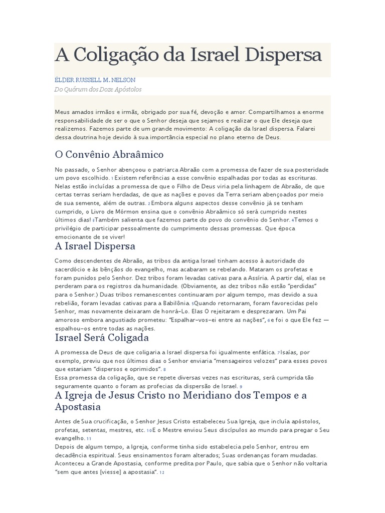Conforme profetizado por Pedro e Paulo, todas as coisas foram restauradas nesta dispensao. Portanto, preciso que acontea, como parte dessa restaurao, a to esperada coligao da Israel dispersa. 15Trata-se de um preldio necessrio Segunda Vinda do Senhor. 16 Essa doutrina da coligao um dos ensinamentos importantes de A Igreja de Jesus Cristo dos Santos dos ltimos Dias. O Senhor declarou: Em verdade vos digo que vos dou um sinal, () quando, de sua longa disperso, reunirei meu povo, casa de Israel, e estabelecerei novamente no meio deles minha Sio. 17 O surgimento do Livro de Mrmon um sinal para o mundo inteiro de que o Senhor comeou a coligar Israel e a cumprir os convnios que fez com Abrao, Isaque e Jac. 18 No apenas ensinamos essa doutrina, mas tambm participamos dela. Fazemos isso ajudando a coligar os eleitos do Senhor nos dois lados do vu. O Livro de Mrmon um ponto central dessa obra. Ele declara a doutrina da coligao. 19 Faz as pessoas aprenderem a respeito de Jesus Cristo, a acreditarem em Seu evangelho e a filiarem-se Sua Igreja. Na verdade, se no houvesse o Livro de Mrmon, a coligao prometida de Israel no aconteceria. 20 Para ns, o honrado nome de Abrao muito importante. Ele mencionado em mais versculos das escrituras da Restaurao do que em todos os versculos da Bblia. 21 Abrao tem uma ligao com todos os membros de A Igreja de Jesus Cristo dos Santos dos ltimos Dias. 22 O Senhor confirmou o convnio Abramico em nossos dias por intermdio do Profeta Joseph Smith. 23 No templo, recebemos as nossas maiores bnos, como herdeiros de Abrao, Isaque e Jac. 24