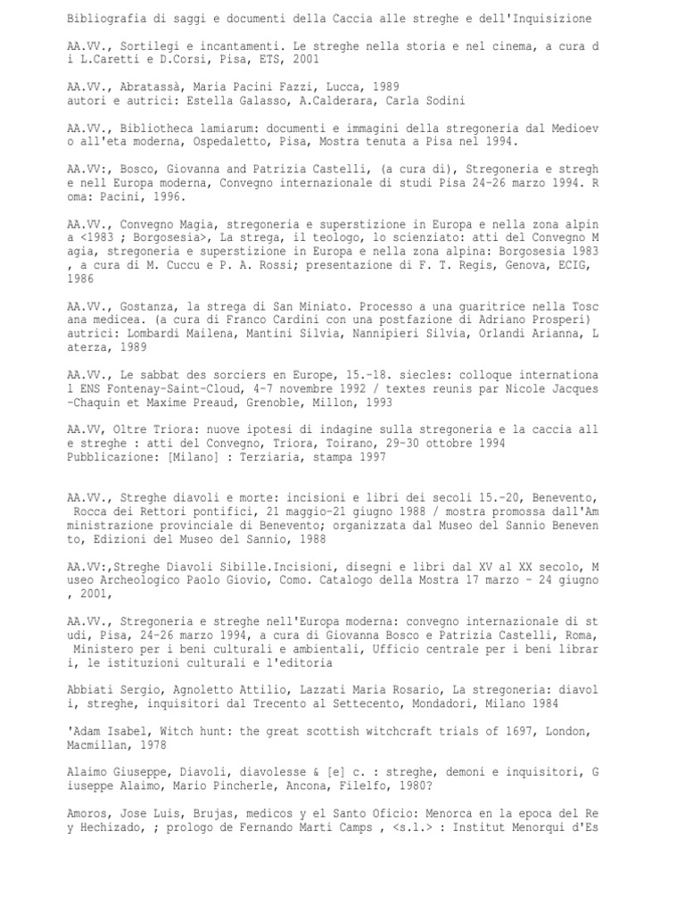 tudis, 1990 Anselmi Sergio, Mercanti, corsari, disperati e streghe, Il Mulino, 2001 Barstow Anne Llewellyn, Witchcraz : a new history of the European witch hunts, S an Francisco, Pandora, 1994 Battisti Giuseppina, Battisti Eugenio, La civilt delle streghe, Milano 1964. Benazzi N. - M. D'amico, Il libro nero dell'inquisizione, Casale Monferrato, PIE MME, 1998 Bennassar B., Storia dell'Inquisizione spagnola, Milano, Rizzoli, 1995 Brnvenuti Paolo, Gostanza da Libbiano. Dal documento al film, (a cura di Laura C aretti), ETS, Pisa, 2000 Bolzoni Franco (a cura di), Le streghe in Italia, Bologna, Cappelli, 1963 Bondi Claudio, Strix : medichesse, streghe e fattucchiere nell'Italia del Rinasc imento, prefazione di Elena Gianini Belotti, Roma, Lucarini, 1989 Bonomo Giuseppe, Caccia alle streghe: la credenza nelle streghe dal secolo XIII al XIX, con particolare riferimento all'Italia, Palumbo, Palermo 1959 Boyer Paul, La citta indemoniata: Salem e le origini sociali di una caccia alle streghe, Paul Boyer e Stephen Nissenbaum, introduzione di Carlo Ginzburg, Torino , G. Einaudi, 1986 Brambilla Elena, Alle origini del Sant'Uffizio: penitenza, confessione e giustiz ia spirituale dal medioevo al XVI secolo, Bologna, Il Mulino, 2000 Briggs Robin, Communities of belief: cultural and social tension in early modern France, Oxford, Clarendon Press, 1989 Campari Francesco Luigi, Un processo di streghe in Piacenza (1611-1615), Arti Gr afiche Piacenza Canosa Romano, Colonnello Isabella, Gli ultimi roghi: la fine della caccia alle streghe in Italia, Sapere 2000, Roma 1983 . Cardini Franco, Magia, stregoneria, superstizioni nell'Occidente medievale, La N uova Italia, Firenze 1979. Cardini Franco, Demoni e meraviglie. Magia e stregoneria nella societ medievale, Bitonto, [Link] 1995 Carmona Michel, Les diables de Loudun: sorcellerie et politique sous Richelieu, Paris, Fayard, 1988 Caro Baroja Julio, Las brujas y su mundo, Alianza, Madrid 1992 (tr. it. Le streg he e il loro mondo, Pratiche, Parma 1994). Centini Massimo, La stregoneria, Milano, Xenia, 1995 Centini Massimo, Stregoneria: demoni e magia nel Piemonte medioevale, Torino, Il punto,1992 Centini Massimo, Le schiave di Diana: stregoneria e sciamanismo tra superstizion e e demonizzazione, Genova, ECIG, 1994