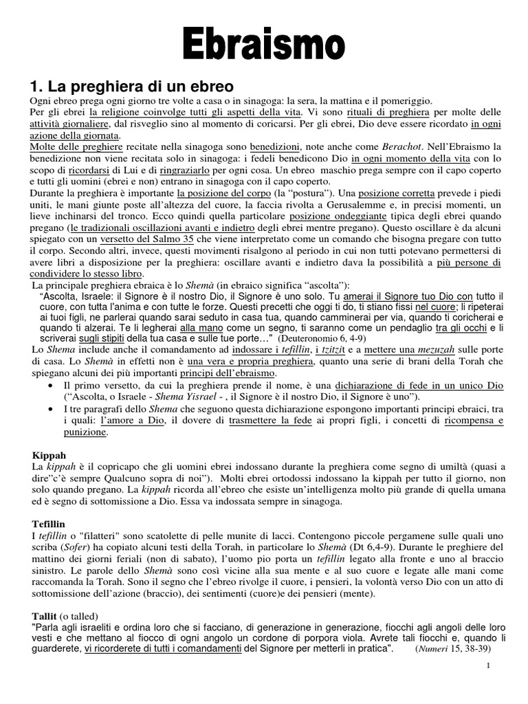 Ogni ebreo prega ogni giorno tre volte a casa o in sinagoga: la sera, la mattina e il pomeriggio. Per gli ebrei la religione coinvolge tutti gli aspetti della vita. Vi sono rituali di preghiera per molte delle attivit giornaliere, dal risveglio sino al momento di coricarsi. Per gli ebrei, Dio deve essere ricordato in ogni azione della giornata. Molte delle preghiere recitate nella sinagoga sono benedizioni, note anche come Berachot. NellEbraismo la benedizione non viene recitata solo in sinagoga: i fedeli benedicono Dio in ogni momento della vita con lo scopo di ricordarsi di Lui e di ringraziarlo per ogni cosa. Un ebreo maschio prega sempre con il capo coperto e tutti gli uomini (ebrei e non) entrano in sinagoga con il capo coperto. Durante la preghiera importante la posizione del corpo (la postura). Una posizione corretta prevede i piedi uniti, le mani giunte poste allaltezza del cuore, la faccia rivolta a Gerusalemme e, in precisi momenti, un lieve inchinarsi del tronco. Ecco quindi quella particolare posizione ondeggiante tipica degli ebrei quando pregano (le tradizionali oscillazioni avanti e indietro degli ebrei mentre pregano). Questo oscillare da alcuni spiegato con un versetto del Salmo 35 che viene interpretato come un comando che bisogna pregare con tutto il corpo. Secondo altri, invece, questi movimenti risalgono al periodo in cui non tutti potevano permettersi di avere libri a disposizione per la preghiera: oscillare avanti e indietro dava la possibilit a pi persone di condividere lo stesso libro. La principale preghiera ebraica lo Shem (in ebraico significa ascolta):