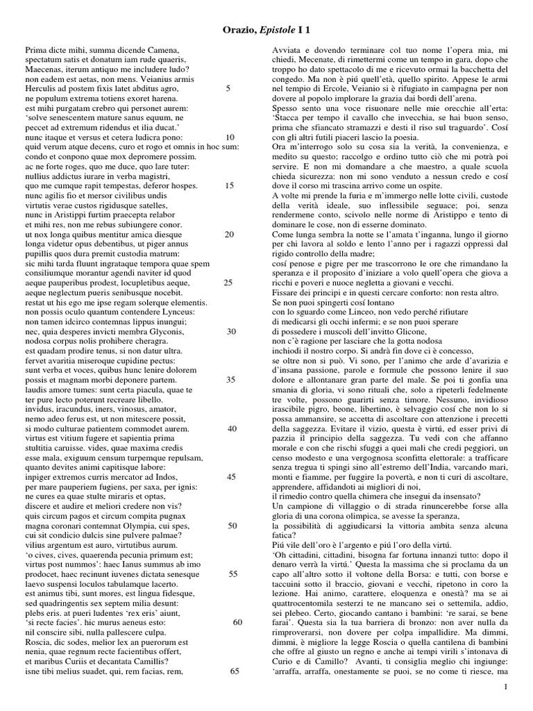 Prima dicte mihi, summa dicende Camena, spectatum satis et donatum iam rude quaeris, Maecenas, iterum antiquo me includere ludo? non eadem est aetas, non mens. Veianius armis Herculis ad postem fixis latet abditus agro, 5 ne populum extrema totiens exoret harena. est mihi purgatam crebro qui personet aurem: solve senescentem mature sanus equum, ne peccet ad extremum ridendus et ilia ducat. nunc itaque et versus et cetera ludicra pono: 10 quid verum atque decens, curo et rogo et omnis in hoc sum: condo et conpono quae mox depromere possim. ac ne forte roges, quo me duce, quo lare tuter: nullius addictus iurare in verba magistri, quo me cumque rapit tempestas, deferor hospes. 15 nunc agilis fio et mersor civilibus undis virtutis verae custos rigidusque satelles, nunc in Aristippi furtim praecepta relabor et mihi res, non me rebus subiungere conor. ut nox longa quibus mentitur amica diesque 20 longa videtur opus debentibus, ut piger annus pupillis quos dura premit custodia matrum: sic mihi tarda fluunt ingrataque tempora quae spem consiliumque morantur agendi naviter id quod aeque pauperibus prodest, locupletibus aeque, 25 aeque neglectum pueris senibusque nocebit. restat ut his ego me ipse regam solerque elementis. non possis oculo quantum contendere Lynceus: non tamen idcirco contemnas lippus inungui; nec, quia desperes invicti membra Glyconis, 30 nodosa corpus nolis prohibere cheragra. est quadam prodire tenus, si non datur ultra. fervet avaritia miseroque cupidine pectus: sunt verba et voces, quibus hunc lenire dolorem possis et magnam morbi deponere partem. 35 laudis amore tumes: sunt certa piacula, quae te ter pure lecto poterunt recreare libello. invidus, iracundus, iners, vinosus, amator, nemo adeo ferus est, ut non mitescere possit, si modo culturae patientem commodet aurem. 40 virtus est vitium fugere et sapientia prima stultitia caruisse. vides, quae maxima credis esse mala, exiguum censum turpemque repulsam, quanto devites animi capitisque labore: inpiger extremos curris mercator ad Indos, 45 per mare pauperiem fugiens, per saxa, per ignis: ne cures ea quae stulte miraris et optas, discere et audire et meliori credere non vis? quis circum pagos et circum compita pugnax magna coronari contemnat Olympia, cui spes, 50 cui sit condicio dulcis sine pulvere palmae? vilius argentum est auro, virtutibus aurum. o cives, cives, quaerenda pecunia primum est; virtus post nummos: haec Ianus summus ab imo prodocet, haec recinunt iuvenes dictata senesque 55 laevo suspensi loculos tabulamque lacerto. est animus tibi, sunt mores, est lingua fidesque, sed quadringentis sex septem milia desunt: plebs eris. at pueri ludentes rex eris aiunt, si recte facies. hic murus aeneus esto: 60 nil conscire sibi, nulla pallescere culpa. Roscia, dic sodes, melior lex an puerorum est nenia, quae regnum recte facientibus offert, et maribus Curiis et decantata Camillis? isne tibi melius suadet, qui, rem facias, rem, 65 Avviata e dovendo terminare col tuo nome lopera mia, mi chiedi, Mecenate, di rimettermi come un tempo in gara, dopo che troppo ho dato spettacolo di me e ricevuto ormai la bacchetta del congedo. Ma non pi quellet, quello spirito. Appese le armi nel tempio di Ercole, Veianio si rifugiato in campagna per non dovere al popolo implorare la grazia dai bordi dellarena. Spesso sento una voce risuonare nelle mie orecchie allerta: Stacca per tempo il cavallo che invecchia, se hai buon senso, prima che sfiancato stramazzi e desti il riso sul traguardo. Cos con gli altri futili piaceri lascio la poesia. Ora minterrogo solo su cosa sia la verit, la convenienza, e medito su questo; raccolgo e ordino tutto ci che mi potr poi servire. E non mi domandare a che maestro, a quale scuola chieda sicurezza: non mi sono venduto a nessun credo e cos dove il corso mi trascina arrivo come un ospite. A volte mi prende la furia e mimmergo nelle lotte civili, custode della verit ideale, suo inflessibile seguace; poi, senza rendermene conto, scivolo nelle norme di Aristippo e tento di dominare le cose, non di esserne dominato. Come lunga sembra la notte se lamata tinganna, lungo il giorno per chi lavora al soldo e lento lanno per i ragazzi oppressi dal rigido controllo della madre; cos penose e pigre per me trascorrono le ore che rimandano la speranza e il proposito diniziare a volo quellopera che giova a ricchi e poveri e nuoce negletta a giovani e vecchi. Fissare dei principi e in questi cercare conforto: non resta altro. Se non puoi spingerti cos lontano con lo sguardo come Linceo, non vedo perch rifiutare di medicarsi gli occhi infermi; e se non puoi sperare di possedere i muscoli dellinvitto Glicone, non c ragione per lasciare che la gotta nodosa inchiodi il nostro corpo. Si andr fin dove ci concesso, se oltre non si pu. Vi sono, per lanimo che arde davarizia e dinsana passione, parole e formule che possono lenire il suo dolore e allontanare gran parte del male. Se poi ti gonfia una smania di gloria, vi sono rituali che, solo a ripeterli fedelmente tre volte, possono guarirti senza timore. Nessuno, invidioso irascibile pigro, beone, libertino, selvaggio cos che non lo si possa ammansire, se accetta di ascoltare con attenzione i precetti della saggezza. Evitare il vizio, questa virt, ed esser privi di pazzia il principio della saggezza. Tu vedi con che affanno morale e con che rischi sfuggi a quei mali che credi peggiori, un censo modesto e una vergognosa sconfitta elettorale: a trafficare senza tregua ti spingi sino allestremo dellIndia, varcando mari, monti e fiamme, per fuggire la povert, e non ti curi di ascoltare, apprendere, affidandoti ai migliori di noi, il rimedio contro quella chimera che insegui da insensato? Un campione di villaggio o di strada rinuncerebbe forse alla gloria di una corona olimpica, se avesse la speranza, la possibilit di aggiudicarsi la vittoria ambita senza alcuna fatica? Pi vile delloro largento e pi loro della virt. Oh cittadini, cittadini, bisogna far fortuna innanzi tutto: dopo il denaro ver