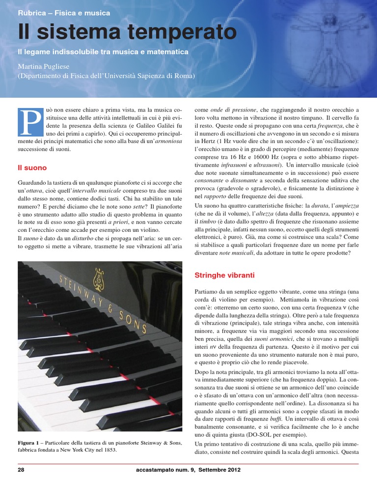 Nella storia molti altri tipi di scale sono stati costruiti, ma veniamo adesso al vero nodo cruciale della questione. Abbiamo detto ` associata a una frequenza. Come stabiliamo quali che ogni nota e frequenze sono per noi importanti e quali no? Come si costruisce un pianoforte (che assegna una frequenza prestabilita a ogni tasto, infatti va ogni tanto accordato)? Il pianoforte divide lottava in dodici tasti e le differenze tra un tasto e il successivo si chiamano semitoni. Unottava viene cos` a essere composta da dodici semitoni. La scala a temperamento equabile si ottiene dividendo lottava in pezzi uguali, per cui ciascuna delle sue note ha una frequenza tale che i rapporti di frequenze tra note adiacenti sono uguali. Il pianoforte, in particolare, si basa su un sistema di temperamento a dodici semitoni. Ma perch e proprio dodici? Questo numero fornisce anche una risposta al perch e le note (quelle non alterate) sono, tradizionalmente, in numero di sette, e dodici con ` che una scala a temperamento equabile quelle alterate. Il punto e a dodici semitoni presenta numerosi vantaggi.