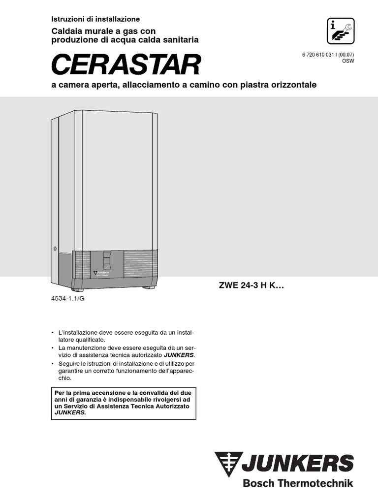 Linstallazione deve essere eseguita da un installatore qualificato. La manutenzione deve essere eseguita da un servizio di assistenza tecnica autorizzato JUNKERS. Seguire le istruzioni di installazione e di utilizzo per garantire un corretto funzionamento dellapparecchio. Per la prima accensione e la convalida dei due anni di garanzia indispensabile rivolgersi ad un Servizio di Assistenza Tecnica Autorizzato JUNKERS.