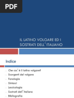Nota dellautore Introduzione Parte prima. Dalle origini al 500 a.C Capitolo primo. Luomo e i materiali linguistici mediterranei Capitolo secondo. Unit e variet nel mondo mediterraneo Capitolo terzo. La affermazione indoeuropea Capitolo quarto. Testimonianze epigrafiche preindeuropee Capitolo quinto. Tradizioni indeuropee I: protolatini, veneti Capitolo sesto. Tradizioni indeuropee II: umbro-sanniti Capitolo settimo. Tradizioni indeuropee III: Leponzi, Messapi, Galli Capitolo ottavo. Le origini di Roma Capitolo nono. Fioritura Regia Capitolo decimo. Primo assetto latino Parte seconda. La latinit: 500 a.C - 500 d.C Capitolo undicesimo. Fissazione delle strutture fonetiche Capitolo dodicesimo. Fissazione di strutture morfologiche sintattiche lessicali Capitolo tredicesimo. Il grecismo Capitolo quattordicesimo. Laccento 1 2 4 5 13 24 34 44 53 61 68 79 89 100 101 113 122 128