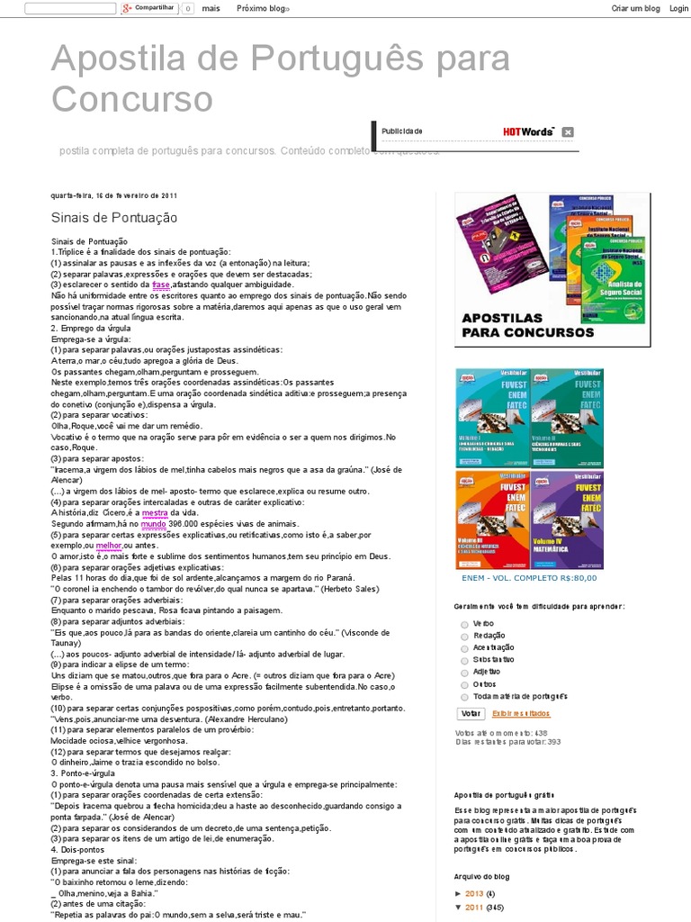 Esse blog representa a maior apostila de portugus para concurso grtis. Muitas dicas de portugus com um contedo atualizado e gratuito. Estude com a apostila online grtis e faa uma boa prova de portugus em concursos pblicos.