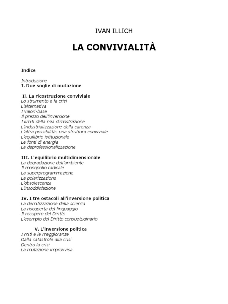 Indice Introduzione I. Due soglie di mutazione Il. La ricostruzione conviviale Lo strumento e la crisi L'alternativa I valori-base Il prezzo dell'inversione I limiti della mia dimostrazione L'industrializzazione della carenza L'altra possibilit: una struttura conviviale L'equilibrio istituzionale Le fonti di energia La deprofessionalizzazione III. L'equilibrio multidimensionale La degradazione dell'ambiente Il monopolio radicale La superprogrammazione La polarizzazione L'obsolescenza L'insoddisfazione IV. I tre ostacoli all'inversione olitica La demitizzazione della scienza La riscoperta del linguaggio Il recupero del Diritto L'esempio del Diritto consuetudinario V. L'inversione olitica I miti e le maggioranze Dalla catastrofe alla crisi Dentro la crisi La mutazione improvvisa