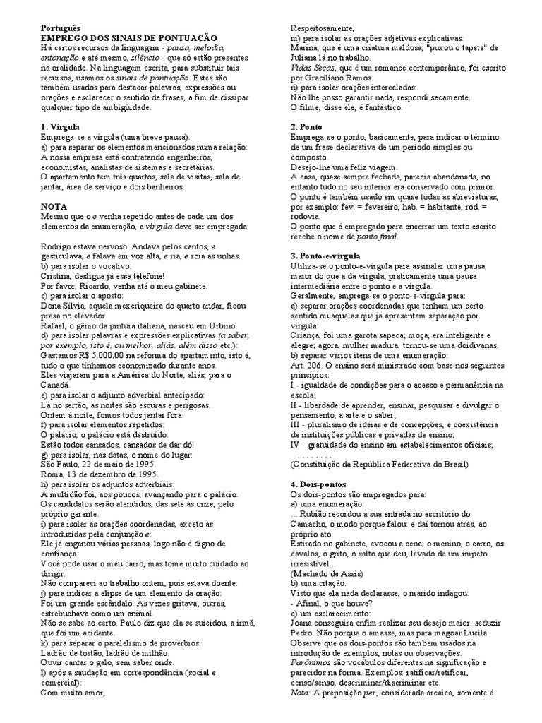 -espeitosamente, m% para isolar as ora es ad+etivas explicativas& ,arina, que uma criatura maldosa, Epuxou o tapeteE de Fuliana l no trabal(o. Vidas Secas, que um romance contemporAneo, !oi escrito por 5raciliano -amos. n% para isolar ora es intercaladas& No l(e posso garantir nada, respondi secamente. ) !ilme, disse ele, !antstico. 2. Ponto Emprega-se o ponto, basicamente, para indicar o trmino de um !rase declarativa de um per#odo simples ou composto. 2ese+o-l(e uma !eli. viagem. ' casa, quase sempre !ec(ada, parecia abandonada, no entanto tudo no seu interior era conservado com primor. ) ponto tambm usado em quase todas as abreviaturas, por exemplo& !ev. G !evereiro, (ab. G (abitante, rod. G rodovia. ) ponto que empregado para encerrar um texto escrito recebe o nome de ponto final. . Ponto!"!#rgula 4tili.a-se o ponto-e-v#rgula para assinalar uma pausa maior do que a da v#rgula, praticamente uma pausa intermediria entre o ponto e a v#rgula. 5eralmente, emprega-se o ponto-e-v#rgula para& a% separar ora es coordenadas que ten(am um certo sentido ou aquelas que + apresentam separa o por v#rgula& /rian a, !oi uma garota sapecaC mo a, era inteligente e alegreC agora, mul(er madura, tornou-se uma doidivanas. b% separar vrios itens de uma enumera o& 'rt. ;8H. ) ensino ser ministrado com base nos seguintes princ#pios& I - igualdade de condi es para o acesso e perman*ncia na escolaC II - liberdade de aprender, ensinar, pesquisar e divulgar o pensamento, a arte e o saberC III - pluralismo de idias e de concep es, e coexist*ncia de institui es pJblicas e privadas de ensinoC I? - gratuidade do ensino em estabelecimentos o!iciaisC ........ $/onstitui o da -epJblica @ederativa do Krasil% $. Do%s!&ontos )s dois-pontos so empregados para& a% uma enumera o& ... -ubio recordou a sua entrada no escritrio do /amac(o, o modo porque !alou& e da# tornou atrs, ao prprio ato. Estirado no gabinete, evocou a cena& o menino, o carro, os cavalos, o grito, o salto que deu, levado de um #mpeto irresist#vel... $,ac(ado de 'ssis% b% uma cita o& ?isto que ela nada declarasse, o marido indagou& - '!inal, o que (ouveL c% um esclarecimento& Foana conseguira en!im reali.ar seu dese+o maior& sedu.ir 1edro. No porque o amasse, mas para magoar 9ucila. )bserve que os dois-pontos so tambm usados na introdu o de exemplos, notas ou observa es. ar!nimos so vocbulos di!erentes na signi!ica o e parecidos na !orma. Exemplos& rati!icarMreti!icar, censoMsenso, descriminarMdiscriminar etc. "ota& ' preposi o per, considerada arcaica, somente