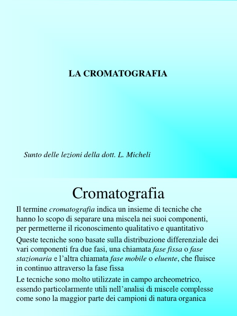 Il termine cromatografia indica un insieme di tecniche che hanno lo scopo di separare una miscela nei suoi componenti, per permetterne il riconoscimento qualitativo e quantitativo Queste tecniche sono basate sulla distribuzione differenziale dei vari componenti fra due fasi, una chiamata fase fissa o fase stazionaria e laltra chiamata fase mobile o eluente, che fluisce in continuo attraverso la fase fissa Le tecniche sono molto utilizzate in campo archeometrico, essendo particolarmente utili nellanalisi di miscele complesse come sono la maggior parte dei campioni di natura organica