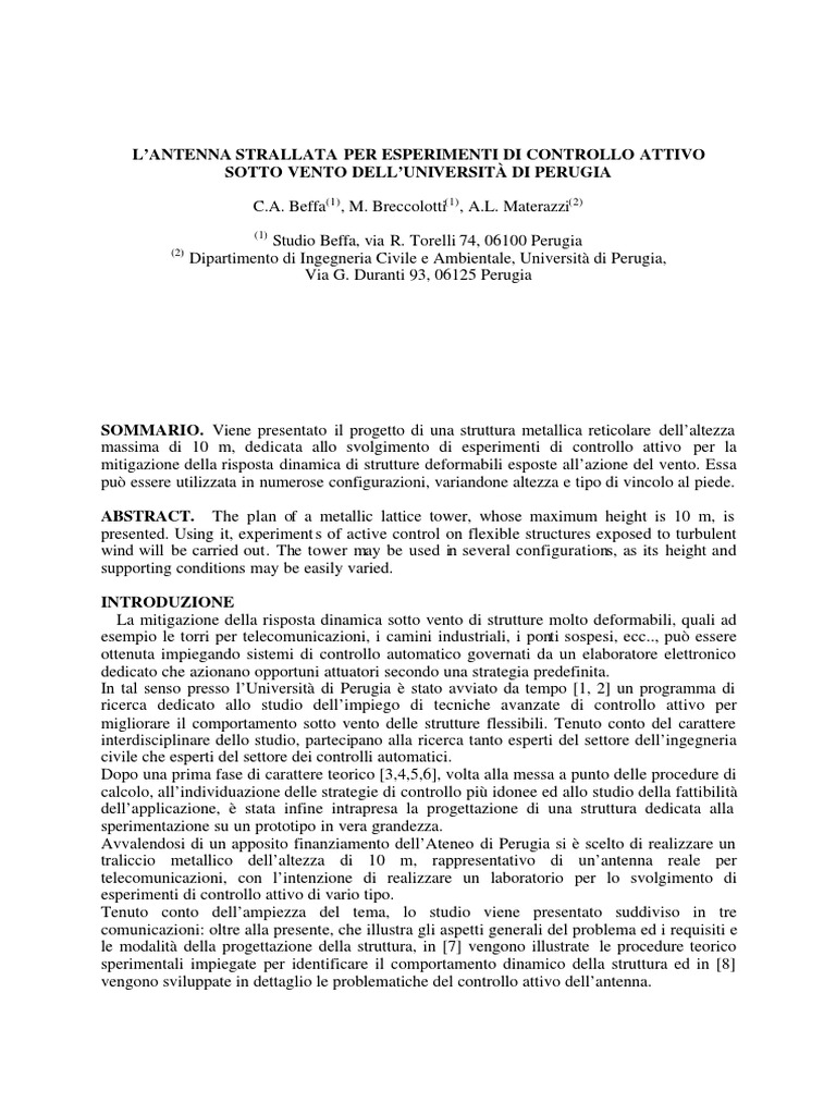 LANTENNA STRALLATA PER ESPERIMENTI DI CONTROLLO ATTIVO SOTTO VENTO DELLUNIVERSIT DI PERUGIA C.A. Beffa(1), M. Breccolotti(1), A.L.