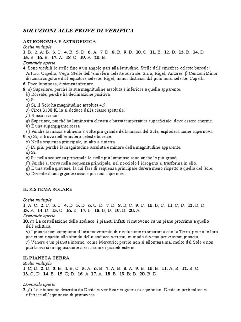 ASTRONOMIA E ASTROFISICA Scelte multiple 1. B. 2. A; B. 3. C. 4. B. 5. D. 6. A. 7. D. 8. B. 9. D. 10. C. 11. B. 12. D. 13. B. 14. D. 15. B. 16. B. 17. A. 18. C. 19. A. 20. B. Domande aperte 4. Sono visibili le stelle fino a un angolo pari alla latitudine. Stelle dellemisfero celeste boreale: Arturo, Capella, Vega. Stelle dellemisfero celeste australe: Sirio, Rigel, Antares, Centauri!inor distan"a angolare dalle#uatore celeste: Rigel; minor distan"a dal polo nord celeste: Capella. 6. $oco luminosa; distan"a inferiore. 8. a% Superiore, perc&' la sua magnitudine assoluta ( inferiore a #uella apparente. b% Boreale, perc&' &a declina"ione positiva. c% S). d% S), il Sole &a magnitudine assoluta *,+. e% Circa ,-.. /, lo si deduce dalla classe spettrale. f % Rosso arancio. g% Superiore, poic&' &a luminosit0 elevata e bassa temperatura superficiale; deve essere enorme. h% 1 una supergigante rossa. i % $oic&' la massa ( almeno 2 volte pi3 grande della massa del Sole, esploder0 come supernova. 9. a% S), si trova nellemisfero celeste boreale. b% 4ella se#uen"a principale, in alto a sinistra. c% Di pi3, perc&' la magnitudine assoluta ( minore della magnitudine apparente. d% S). e% S): nella se#uen"a principale le stelle pi3 luminose sono anc&e le pi3 grandi. f % $oic&' si trova nella se#uen"a principale, nel nocciolo lidrogeno si trasforma in elio. g% 1 una stella giovane, la cui fase di se#uen"a principale durer0 meno rispetto a #uella del Sole. h% Diventer0 una gigante rossa e poi una supernova. IL SISTEMA SOLARE Scelte multiple 1. A; C. 2. C. 3. C. 4. D. 5. D. 6. C; D. 7. D. 8. B; C. 9. C. 10. B; C. 11. C; D. 12. B; D. 13. A. 14. D. 15. C. 16. B. 17. B. 18. B; D. 19. B. 20. A. Domande aperte 10. a% 5a costella"ione dello "odiaco: i pianeti infatti si muovono su un piano prossimo a #uello delleclittica. b% 6 pianeti non compiono il loro movimento di rivolu"ione in sincronia con la 7erra, perci8 le loro posi"ioni rispetto allo sfondo dello "odiaco variano, in modo diverso per ciascun pianeta. c% Venere ( un pianeta interno, come !ercurio; perci8 non si allontana mai molto dal Sole e non pu8 trovarsi in opposi"ione a esso come i pianeti esterni. IL PIANETA TERRA Scelte multiple 1. C; D. 2. D. 3. B. 4. B; C. 5. A. 6. B. 7. A; B. 8. A. 9. B. 10. B. 11. A; B. 12. B; C. 13. C; D. 14. B. 15. C; D. 16. A. 17. A. 18. B. 19. B; D. 20. B; D. Domande aperte 2. f % 5a situa"ione descritta da Dante si verifica nei giorni di e#uino"io. Dante in particolare si riferisce alle#uino"io di primavera.