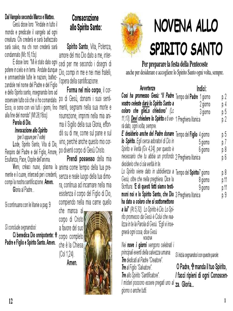 Lode, Spirito Santo, Vita di Dio, Respiro del Padre e del Figlio, Amore, Esultanza, Pace, Ospite dellanima. Vieni, craci nuovi, plasma la mente e il cuore, intercedi per i credenti, compi la nostra santificazione. Amen. Gloria al Padre... Si continuano con le litanie a pag. 9 Si conclude segnandosi: Ci benedica Dio onnipotente: Padre e Figlio e Spirito Santo. Amen.