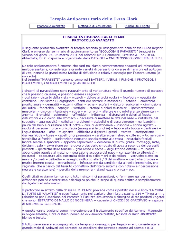 TERAPIA ANTIPARASSITARIA CLARK PROTOCOLLO AVANZATO Il seguente protocollo avanzato di terapia secondo gli insegnamenti della [Link] Hulda Regehr Clark emerso dal seminario di aggiornamento su C!"!#IA PARA$$I%I& tenutosi in 'erona nei giorni ()* (+ marzo (,,- dai relatori. Dr P. Commerci* Pro/.ssa A. Iori* Dr 0. A11attista* Dr C. Capozza e organizzato dalla Ditta !%I 2 !0 !%!$$IC!"!#ICI I%A"IA $.R.". Da tale aggiornamento emerso che tutti noi siamo costantemente soggetti ad in/estazione multiparassitaria* considerata la grande variet3 di parassiti di diverse dimensioni ed a1itudini di vita* nonch4 la grandissima /acilit3 di di//usione e relativo contagio per l5essere umano 6e non solo7. 8el termine PARA$$I%I& vengono compresi i 9A%% RI* i 'IR:$* i F:8#HI* i PR!%!;!I* i P"A% "0I8%I* i 8 0A% "0I8%I e gli AR%R!P!DI. I sintomi di parassitismo sono naturalmente di varia natura visto il grande numero di parassiti che li possono causare* e possono essere i seguenti. < occhiaie 2 distur1i della vista 2 orzaioli 2 dolore ai glo1i oculari 2 /oto/o1ia 2 opacit3 del cristallino 2 1ru=ismo 6il digrignare i denti e>o serrare le mascelle7 2 ce/alea 2 emicrania 2 prurito anale 2 dermatiti 2 eczemi di//usi 2 acne 2 acu/eni 2 distur1i auricolari 2 diminuzione dell5udito 2 /ono/o1ia 2 capogiri 2 vertigini 2 crampi e dolori muscolari 2 ipercontratture muscolari 2 dis1iosi intestinale 2 stipsi 2 emorroidi 2 allergie e > o intolleranze alimentari 2 anemia < 9ronchiti 2 polmoniti 2 ra//reddori 2 in/luenza 2 dis/unzioni e dolori al /egato 2 dis/unzioni e > o dolori allo stomaco 2 necessit3 di mettere le dita nel naso 2 irrita1ilit3 del soggetto 2 aggressivit3 2 cellulite 2 pro1lemi meta1olici e di assor1imento 2 nei 1am1ini. paura del 1uio e di restare soli di notte 2 crisi di acetonemia 2 insonnia 2 sonno agitato 2 incu1i di persone morte 2 onico/agia 6mangiarsi le unghie7 2 /e11re alla 1occa 2 denti neri 2 lingua /issurata 2 a/te 2 mughetto 2 di//icolt3 a digerire i grassi 2 vomito 2 costipazione 2 diarrea /etida 2 tosse 2 capelli grigi prematuri 2 carattere permaloso e collerico 2 tic nervosi 2 sensi1ilit3 al /reddo 2 sudorazione notturna specialmente alla testa 2 nevralgie /acciali 2 la11ra secche e spaccate 2 appetito capriccioso 2 desiderio di 1urro* grassi* /ormaggi* latte* dolciumi* sale 2 avversione per le uova o desiderio smodato di uova a seconda dei parassiti presenti 2 ipertro/ia delle tonsille 2 gola rossa e secca 2 deglutizione di//icile 2 mucosit3 a11ondante espulsa al mattino 2 secrezione ac?uosa dal naso 2 corizza 6rinite allergica7 2 epistassi 2 spaccature alle estremit3 delle dita delle mani e dei talloni 2 verruche piatte su mani e >o piedi 2 1al1ettio 2 risveglio notturno alle ( > @ del mattino 2 ipertro/ia tiroidea 2 prurito interno coscia 2 e=trasistolia 2 in/estazione da candida 6sia a livello intestinale* che vaginale* che a carico del tessuto connettivo dell5intero sistema con notevole ripercussione neurale e caratteriale7 2 perdita della memoria 2 stanchezza cronica 2 ecc. Auelli citati ovviamente non sono tutti i sintomi di parassitosi* ci /ermiamo ?ui per non di//ondere panico e terrorismo psicologico poich4 lo scopo di ?uesto scritto semplicemente divulgativo ed in/ormativo. Il protocollo avanzato della [Link] H. R. C"ARB prevede come riportato nel suo li1ro "A C:RA DI %:%% " 0A"A%%I & e speci/icatamente nel capitolo che inizia a pagina @-) C Programma r1oristico per l5:ccisione dei Parassiti&. l5utilizzo simultaneo e sinergico di tre prodotti vegetali che sono. $%RA%%! DI 0A""! DI 8!C 8 RA D capsule di CHI!DI DI #AR!FA8! D capsule di AR% 0I$IA 2A$$ 8;I!. A ?uesto vanno aggiunti come innovazione per il trattamento speci/ico del terreno. 0agnesio in oligoelemento* Fiore di 9ach idoneo ed ovviamente testato* 8osode di 9ach altrettanto idoneo e testato. Il tutto deve essere accompagnato da terapia di drenaggio per /egato e reni* considerata la grande mole di cadaveri dei parassiti da espellere che potre11e essere ad esempio 9I!<