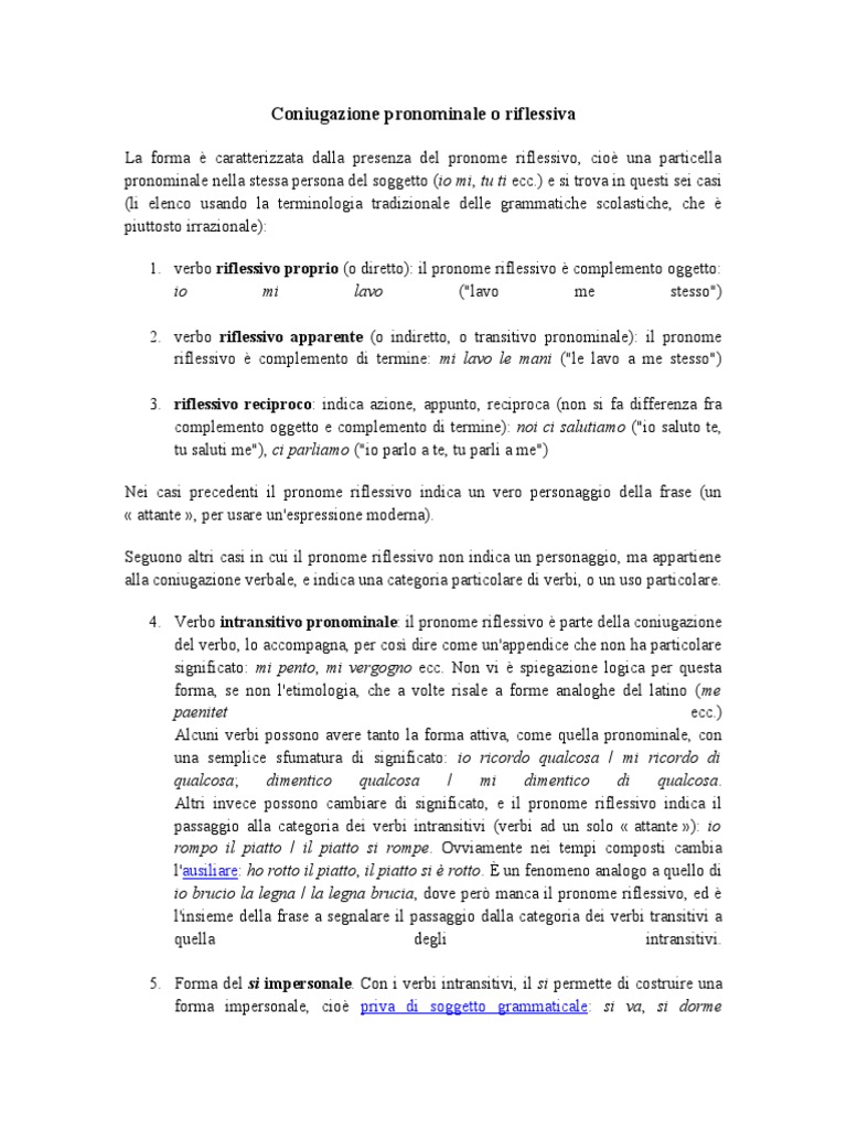 La forma caratterizzata dalla presenza del pronome riflessivo, cio una particella pronominale nella stessa persona del soggetto (io mi, tu ti ecc.) e si trova in questi sei casi (li elenco usando la terminologia tradizionale delle grammatiche scolastiche, che piuttosto irrazionale): 1. verbo riflessivo proprio (o diretto): il pronome riflessivo complemento oggetto: io mi lavo ("lavo me stesso") . verbo riflessivo apparente (o indiretto, o transitivo pronominale): il pronome riflessivo complemento di termine: mi lavo le mani ("le lavo a me stesso") !. riflessivo reciproco: indica azione, appunto, reciproca (non si fa differenza fra complemento oggetto e complemento di termine): noi ci salutiamo ("io saluto te, tu saluti me"), ci parliamo ("io parlo a te, tu parli a me") "ei casi precedenti il pronome riflessivo indica un vero personaggio della frase (un # attante $, per usare un%espressione moderna). &eguono altri casi in cui il pronome riflessivo non indica un personaggio, ma appartiene alla coniugazione verbale, e indica una categoria particolare di verbi, o un uso particolare. '. (erbo intransitivo pronominale: il pronome riflessivo parte della coniugazione del verbo, lo accompagna, per cos) dire come un%appendice che non ha particolare significato: mi pento, mi vergogno ecc. "on vi spiegazione logica per questa forma, se non l%etimologia, che a volte risale a forme analoghe del latino ( me paenitet ecc.) *lcuni verbi possono avere tanto la forma attiva, come quella pronominale, con una semplice sfumatura di significato: io ricordo qualcosa + mi ricordo di qualcosa, dimentico qualcosa + mi dimentico di qualcosa. *ltri invece possono cambiare di significato, e il pronome riflessivo indica il passaggio alla categoria dei verbi intransitivi (verbi ad un solo # attante $): io rompo il piatto + il piatto si rompe. -vviamente nei tempi composti cambia l%ausiliare: ho rotto il piatto, il piatto si rotto. . un fenomeno analogo a quello di io brucio la legna + la legna brucia, dove per/ manca il pronome riflessivo, ed l%insieme della frase a segnalare il passaggio dalla categoria dei verbi transitivi a quella degli intransitivi. 0. 1orma del si impersonale. 2on i verbi intransitivi, il si permette di costruire una forma impersonale, cio priva di soggetto grammaticale: si va, si dorme