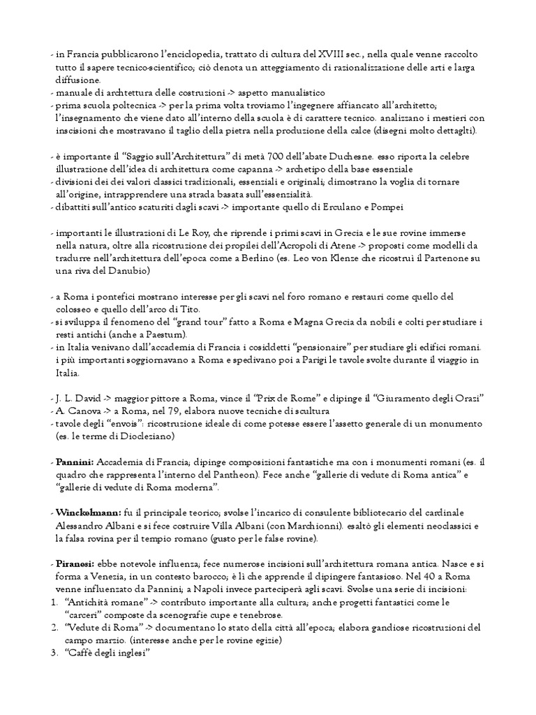 - J. L. David -> maggior pittore a Roma, vince il Prix de Rome e dipinge il Giuramento degli Orazi - A. Canova -> a Roma, nel 79, elabora nuove tecniche di scultura - tavole degli envois: ricostruzione ideale di come potesse essere lassetto generale di un monumento (es. le terme di Diocleziano) - Pannini: Accademia di Francia; dipinge composizioni fantastiche ma con i monumenti romani (es. il quadro che rappresenta linterno del Pantheon). Fece anche gallerie di vedute di Roma antica e gallerie di vedute di Roma moderna. - Winckelmann: fu il principale teorico; svolse lincarico di consulente bibliotecario del cardinale Alessandro Albani e si fece costruire Villa Albani (con Marchionni). esalt gli elementi neoclassici e la falsa rovina per il tempio romano (gusto per le false rovine). - Piranesi: ebbe notevole influenza; fece numerose incisioni sullarchitettura romana antica. Nasce e si forma a Venezia, in un contesto barocco; l che apprende il dipingere fantasioso. Nel 40 a Roma venne influenzato da Pannini; a Napoli invece parteciper agli scavi. Svolse una serie di incisioni: 1. Antichit romane -> contributo importante alla cultura; anche progetti fantastici come le carceri composte da scenografie cupe e tenebrose. 2. Vedute di Roma -> documentano lo stato della citt allepoca; elabora gandiose ricostruzioni del campo marzio. (interesse anche per le rovine egizie) 3. Caff degli inglesi