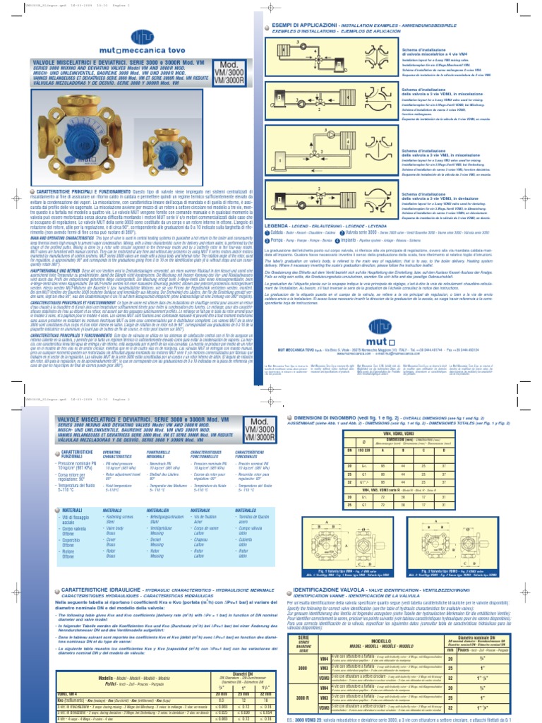 MAIN AND OPERATING CHARACTERISTICS This type of valve is used in central heating systems to guarantee a hot return to the boiler and consequently keep thermal levels high enough to prevent vapor condensation. Mixing, with a linear characteristic curve for delivery and return water, is performed by the shape of the profiled paths. Mixing is done by a rotor with circular segment in the three-way model and by a butterfly rotor in the four-way model. MUT valves are furnished with manual controls. They can be motorized at any time and without any problems by using MUT V series motors and/or motors marketed by manufacturers of control systems. MUT series 3000 valves are made with a brass body and internal rotor. The rotation angle of the rotor, used for regulation, is approximately 90 and corresponds to the graduations going from 0 to 10 on the identification plate (it is without stops and can consequently rotate 360). HAUPTMERKMALE UND BETRIEB Diese Art von Ventilen wird in Zentralheizanlagen verwendet, um einen warmen Rcklauf in den Kessel und somit eine ausreichend hohe Temperatur zu gewhrleisten, damit die Dmpfe nicht kondensieren. Die Mischung mit linearer Kennung des Vor- und Rcklaufwassers wird durch das Profil der entsprechend geformten Wege sichergestellt. Die Mischung erfolgt beim 3-Wege-Ventil ber einen Kreissegmentlufer, beim 4-Wege-Ventil ber einen Klappenlufer. Die MUT-Ventile werden mit einer manuellen Steuerung geliefert, knnen aber jederzeit problemlos motorgesteuert werden. Hierzu werden MUT-Motoren der Baureihe V bzw. handelsbliche Motoren, wie sie von Firmen der Regeltechnik vertrieben werden, montiert. Bei den MUT-Ventilen der Baureihe 3000 bestehen Gehuse und Innenlufer aus Messing. Der Drehwinkel des Lufers, der fr die Einstellung genutzt werden kann, liegt bei etwa 90, was den Gradeinteilungen 0 bis 10 auf dem Bezugsschild entspricht (ohne Endanschlge ist eine Drehung von 360 mglich). CARACTERISTIQUES PRINCIPALES ET FONCTIONNEMENT Ce type de vanne est utilise dans des installations de chauffage central pour assurer un retour deau chaude la chaudire et davoir ainsi une temprature suffisamment leve pour viter la condensation des fumes. Le mlange, pour des caractristiques stabilises de leau au dpart et au retour, est assur par des passages judicieusement profils. Le mlange se fait par le biais du rotor arrondi pour le modle 3 voies, et papillon pour le modle 4 voies. Les vannes MUT sont fournies avec commande manuelle et peuvent tre tout moment motorises sans aucun problme en installant les moteurs lectriques MUT ou bien ceux commercialiss par le distributeur comptent. Les vannes MUT de la srie 3000 sont constitues dun corps et dun rotor interne en laiton. Langle de rotation de ce rotor est de 90, correspondant aux graduations de 0 10 de la plaquette indicatrice en aluminium (nayant pas de butes de fin de course, le rotor peut tourner sur 360). CARACTERSTICAS PRINCIPALES Y FUNCIONAMIENTO Este tipo de vlvulas se utiliza en los sistemas de calefaccin central con el fin de asegurar un retorno caliente en la caldera, y permite por lo tanto un rgimen trmico lo suficientemente elevado como para evitar la condensacin de vapores. La mezcla, con caracterstica lineal del agua de entrega y de retorno, est asegurada por el perfil de las vas curvadas. La mezcla se produce por medio de un rotor que en el modelo de tres vas es de sector circular, mientras que en el de cuatro vas es de mariposa. Las vlvulas MUT se entregan con mando manual, pero un cualquier momento pueden ser motorizadas sin dificultad alguna montando los motores MUT serie V y/o motores comercializados por fbricas que trabajen en el sector de la regulacin. Las vlvulas MUT de la serie 3000 estn constitudas por un cuerpo y un rotor interno de latn. El ngulo de rotacin del rotor, til para la regulacin, es de aproximadamente 90, lo que se corresponde con las graduaciones de 0 a 10 indicadas en la placa de referencia (en caso de que no haya topes de final de carrera puede girar 360).