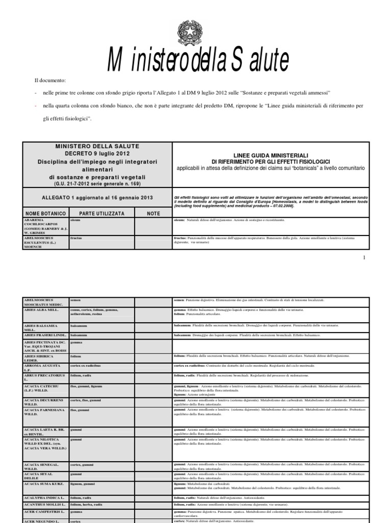 nelle prime tre colonne con sfondo grigio riporta lAllegato 1 al DM 9 luglio 2012 sulle Sostanze e preparati vegetali ammessi nella quarta colonna con sfondo bianco, che non parte integrante del predetto DM, ripropone le Linee guida ministeriali di riferimento per gli effetti fisiologici.
