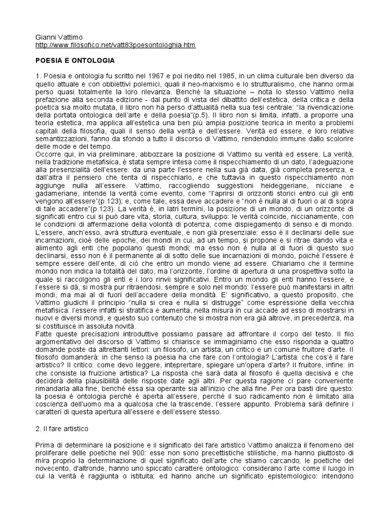 Gianni Vattimo [Link] POESIA E ONTOLOGIA 1. Poesia e ontologia fu scritto nel 1967 e poi rie ito nel 198!