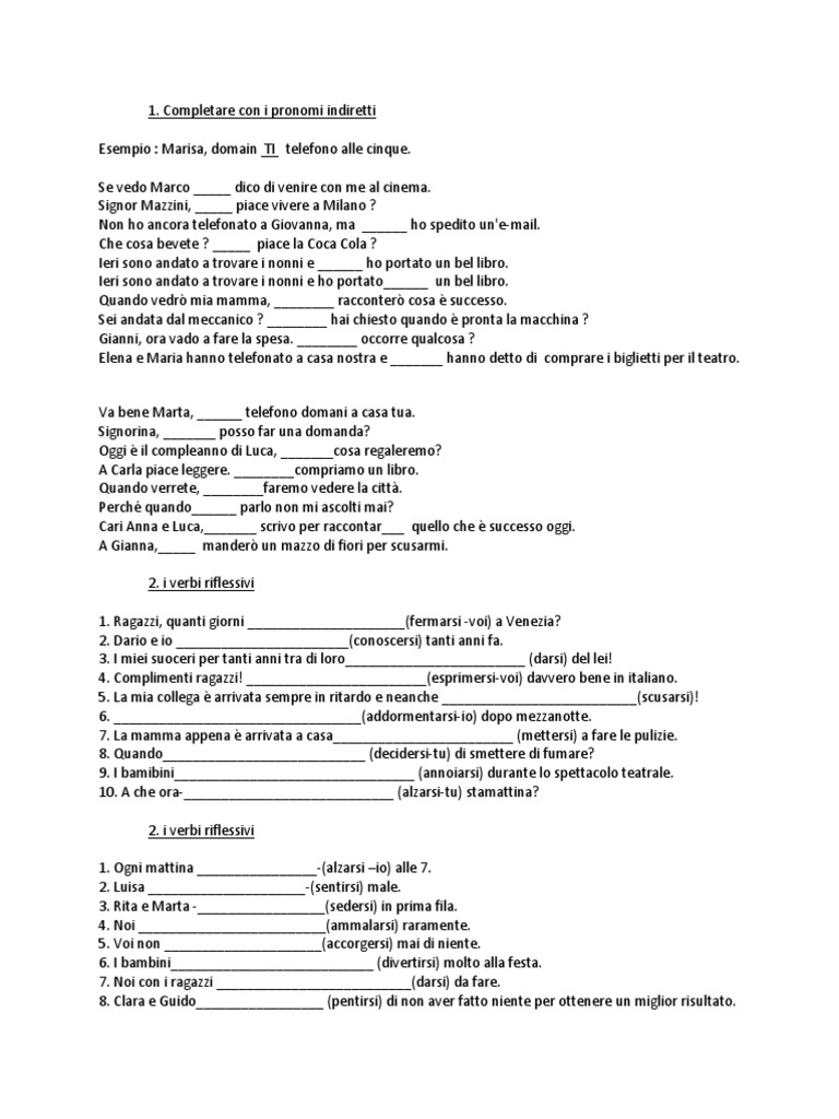 Va bene Marta, ______ telefono domani a casa tua. Signorina, _______ posso far una domanda? Oggi il compleanno di Luca, _______cosa regaleremo? A Carla piace leggere. ________compriamo un libro. Quando verrete, ________faremo vedere la citt. Perch quando______ parlo non mi ascolti mai? Cari Anna e Luca,_______ scrivo per raccontar___ quello che successo oggi. A Gianna,_____ mander un mazzo di fiori per scusarmi. 2. i verbi riflessivi 1. Ragazzi, quanti giorni _____________________(fermarsi -voi) a Venezia? 2. Dario e io _______________________(conoscersi) tanti anni fa. 3. I miei suoceri per tanti anni tra di loro________________________ (darsi) del lei! 4. Complimenti ragazzi! ________________________(esprimersi-voi) davvero bene in italiano. 5. La mia collega arrivata sempre in ritardo e neanche __________________________(scusarsi)! 6. _________________________________(addormentarsi-io) dopo mezzanotte. 7. La mamma appena arrivata a casa________________________ (mettersi) a fare le pulizie. 8. Quando___________________________ (decidersi-tu) di smettere di fumare? 9. I bamibini________________________________ (annoiarsi) durante lo spettacolo teatrale. 10. A che ora-____________________________ (alzarsi-tu) stamattina? 2. i verbi riflessivi 1. Ogni mattina ________________-(alzarsi io) alle 7. 2. Luisa _____________________-(sentirsi) male. 3. Rita e Marta -_________________(sedersi) in prima fila. 4. Noi _________________________(ammalarsi) raramente. 5. Voi non _____________________(accorgersi) mai di niente. 6. I bambini___________________________ (divertirsi) molto alla festa. 7. Noi con i ragazzi __________________________(darsi) da fare. 8. Clara e Guido_________________ (pentirsi) di non aver fatto niente per ottenere un miglior risultato.