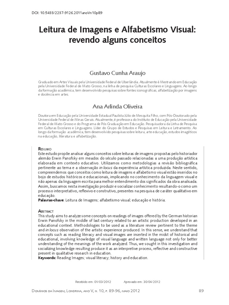 inseridos no bojo de pesquisas produzidas na histria da educao brasileira, implicando no conhecimento da linguagem visual e no apenas da linguagem escrita. Ambas se complementam e assumem um papel fundamental e relevante para pesquisas na educao e para a aprendizagem educativa, no contexto escolar, produzindo conhecimento para a educao. Por fim, podemos concluir este artigo afirmando que as imagens so produzidas para se comunicar, visto que os nveis propostos por Panofsky (1976) apresentados durante esta pesquisa, sobre tudo relacionado leitura de imagem, esto relacionados aos estudos sobre prticas e representaes dos estudos culturais, ao abordarem diversas possibilidades de interpretaes e significaes que as imagens podem oferecer ao leitor que se apropriar de tais conceitos durante a anlise de determinada obra/ trabalho artstico produzido. Desse modo,