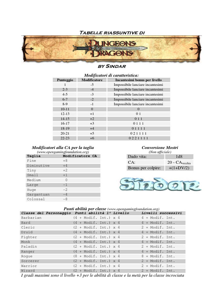 Dungeon & Dragons Wizards of the Coast. Tabelle riportate per consultazione privata.