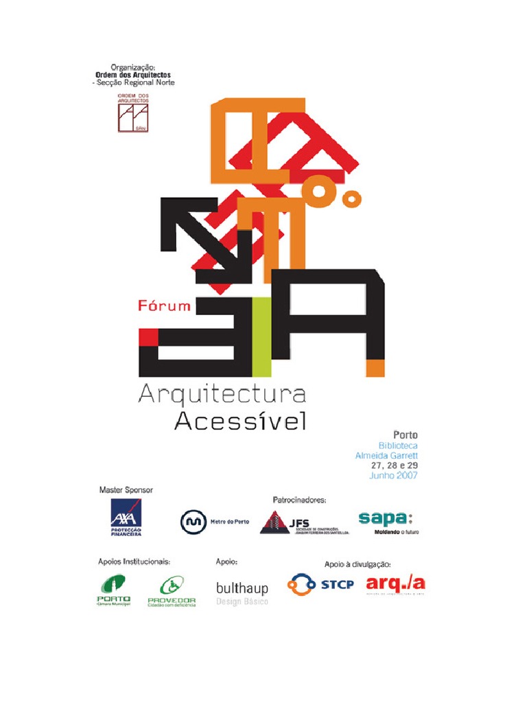 Organizao Ordem dos Arquitectos Seco Regional do Norte Provedoria para o Cidado com Deficincia da Cmara Municipal do Porto Master Sponsor AXA Proteco Financeira Patrocinadores Metro do Porto | JFS Sociedade de Construes | SAPA Apoios Institucionais Cmara Municipal do Porto Provedoria para o Cidado com Deficincia da Cmara Municipal do Porto Apoio BULTHAUP Design Bsico Apoio Divulgao STCP | ARQ./A Empresas participantes na Mostra de Ajudas Tcnicas Ataraxia | Laser Build | ProAsolutions | Escada Fcil Organizao OA-SRN Pelouro do Apoio Prtica Profissional Coordenao Arqt. Joo Paulo Loureiro Arqt. Teresa Clix Arqt. Susana Machado Produo / Comunicao Carlos Alberto Faustino Maria Joo Corteso Concepo Grfica do Frum Atelier Joo Borges Fotografia Paulo Correia Carlos Alberto Faustino