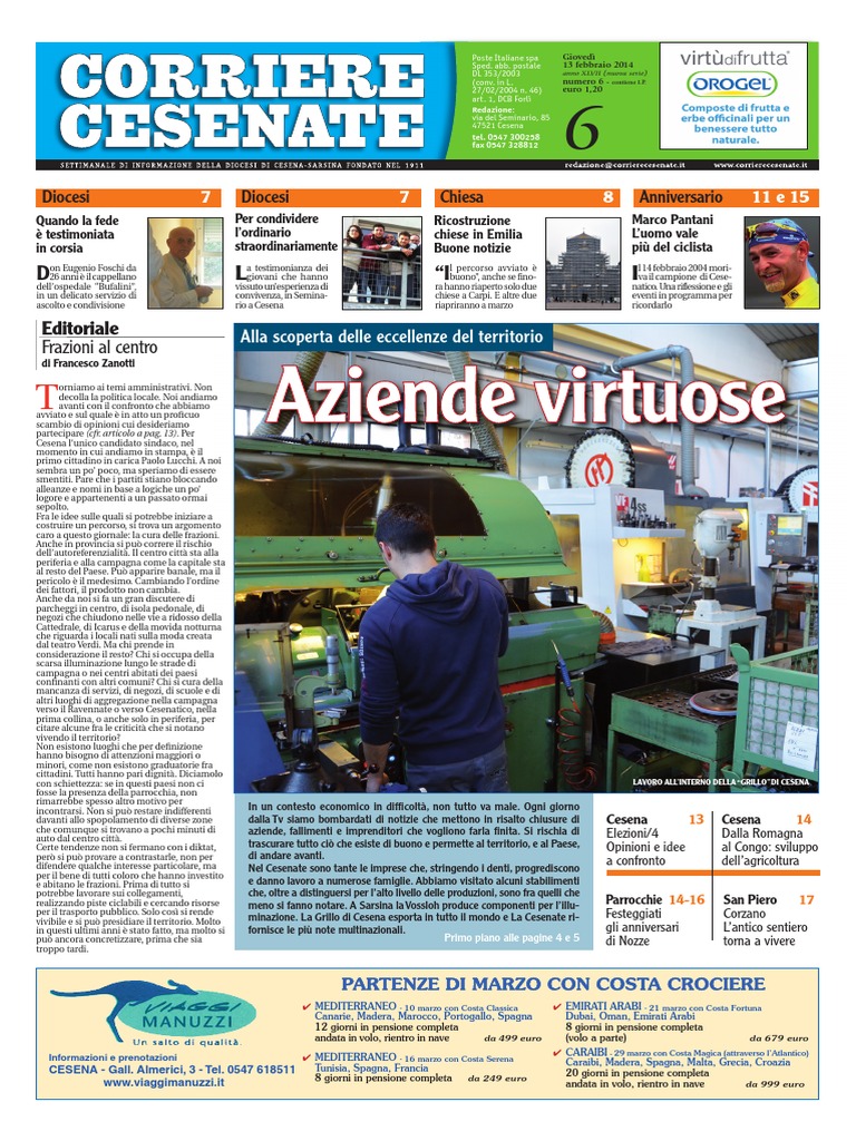 Redazione, Segreteria e Amministrazione via del Seminario, 85, 47521 Cesena (Fc) tel. 0547 300258, fax 0547 328812, [Link] Conto corrente postale n. 14191472 E-mail: redazione@[Link] Abbonamenti annuo ordinario euro 45; sostenitore 70 euro; di amicizia 100 euro; estero (via aerea) 80 euro. Settimanale dinformazione Autorizz. Trib. Forl n. 409, 20/2/68 Iscrizione al Registro nazionale della stampa n. 4.234 Editore e Propriet Diocesi di Cesena-Sarsina Stampa Rotopress via Brecce - 60025 Loreto (Ancona) [Link]