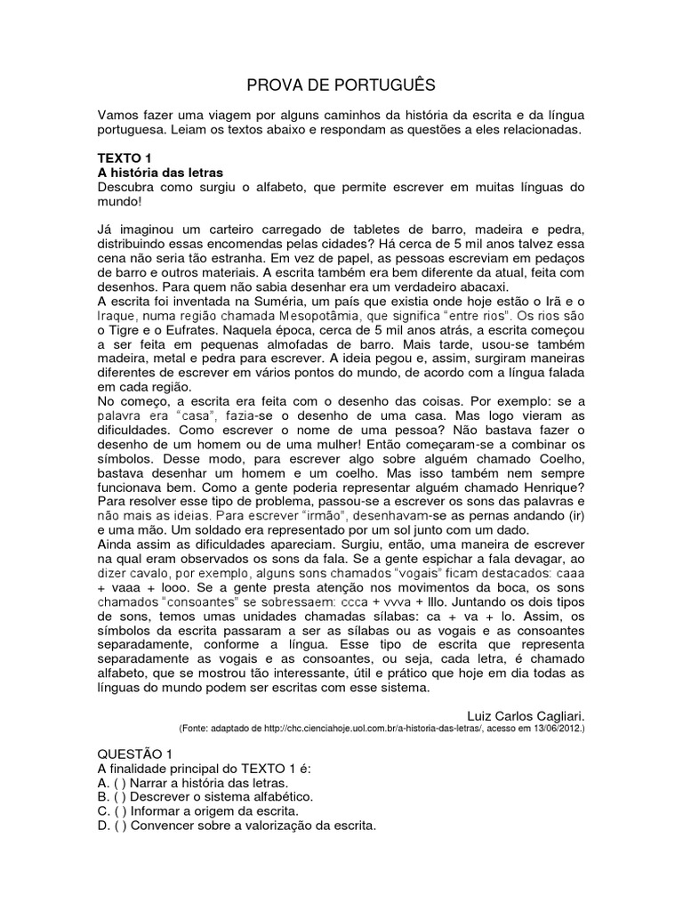 Vamos fazer uma viagem por alguns caminhos da história da escrita e da língua portuguesa. Leiam os textos abaixo e respondam as questões a eles relacionadas.