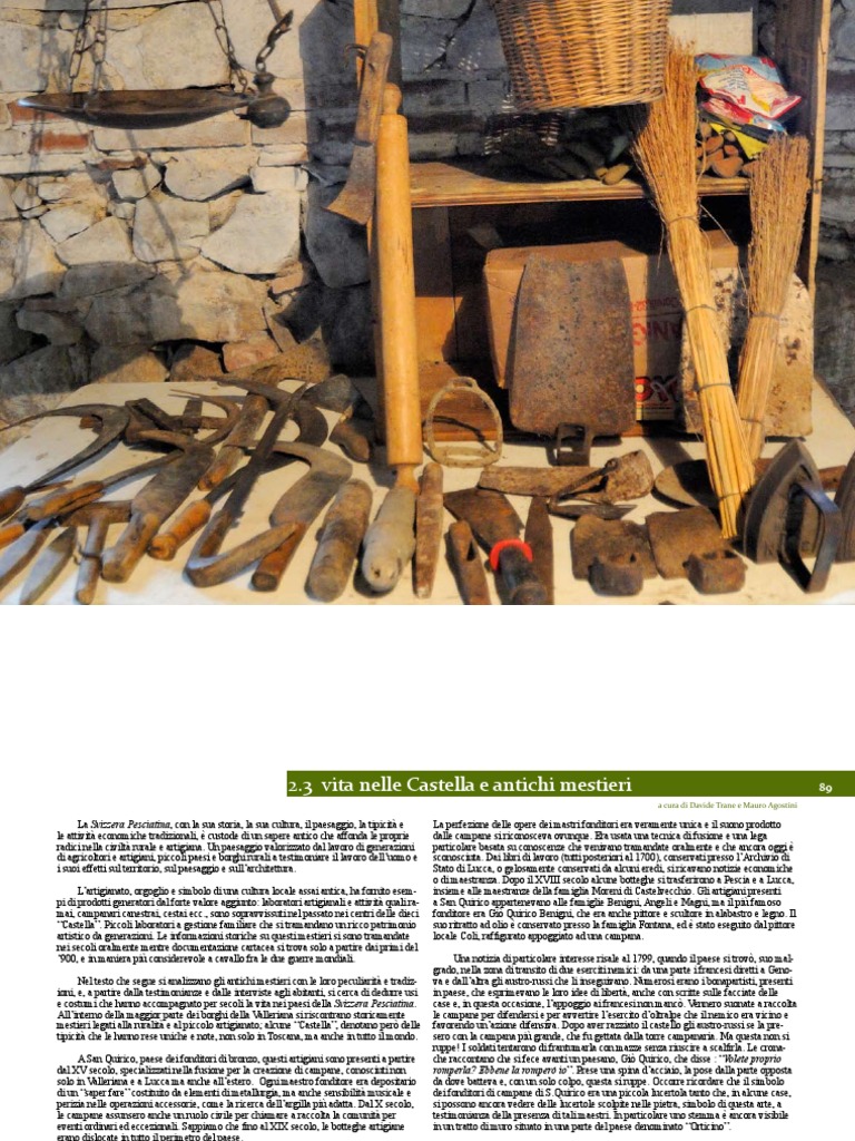 La Svizzera Pesciatina, con la sua storia, la sua cultura, il paesaggio, la tipicit e le attivit economiche tradizionali, custode di un sapere antico che affonda le proprie radici nella civilt rurale e artigiana. Un paesaggio valorizzato dal lavoro di generazioni di agricoltori e artigiani, piccoli paesi e borghi rurali a testimoniare il lavoro delluomo e i suoi effetti sul territorio, sul paesaggio e sullarchitettura. Lartigianato, orgoglio e simbolo di una cultura locale assai antica, ha fornito esempi di prodotti generatori dal forte valore aggiunto: laboratori artigianali e attivit quali ramai, campanari canestrai, cestai ecc., sono sopravvissuti nel passato nei centri delle dieci Castella. Piccoli laboratori a gestione familiare che si tramandano un ricco patrimonio artistico da generazioni. Le informazioni storiche su questi mestieri si sono tramandate nei secoli oralmente mentre documentazione cartacea si trova solo a partire dai primi del 900, e in maniera pi considerevole a cavallo fra le due guerre mondiali. Nel testo che segue si analizzano gli antichi mestieri con le loro peculiarit e tradizioni, e, a partire dalla testimonianze e dalle interviste agli abitanti, si cerca di dedurre usi e costumi che hanno accompagnato per secoli la vita nei paesi della Svizzera Pesciatina. Allinterno della maggior parte dei borghi della Valleriana si riscontrano storicamente mestieri legati alla ruralit e al piccolo artigianato; alcune Castella, denotano per delle tipicit che le hanno rese uniche e note, non solo in Toscana, ma anche in tutto il mondo. A San Quirico, paese dei fonditori di bronzo, questi artigiani sono presenti a partire dal XV secolo, specializzati nella fusione per la creazione di campane, conosciuti non solo in Valleriana e a Lucca ma anche allestero. Ogni maestro fonditore era depositario di un saper fare costituito da elementi di metallurgia, ma anche sensibilit musicale e perizia nelle operazioni accessorie, come la ricerca dellargilla pi adatta. Dal X secolo, le campane assunsero anche un ruolo civile per chiamare a raccolta la comunit per eventi ordinari ed eccezionali. Sappiamo che fino al XIX secolo, le botteghe artigiane erano dislocate in tutto il perimetro del paese.