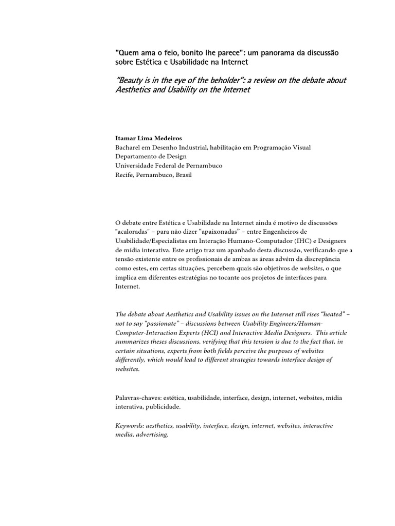 O debate entre Esttica e Usabilidade na Internet ainda motivo de discusses "acaloradas" para no dizer apaixonadas entre Engenheiros de Usabilidade/Especialistas em Interao Humano-Computador (IHC) e Designers de mdia interativa. Este artigo traz um apanhado desta discusso, verificando que a tenso existente entre os profissionais de ambas as reas advm da discrepncia como estes, em certas situaes, percebem quais so objetivos de websites, o que implica em diferentes estratgias no tocante aos projetos de interfaces para Internet.