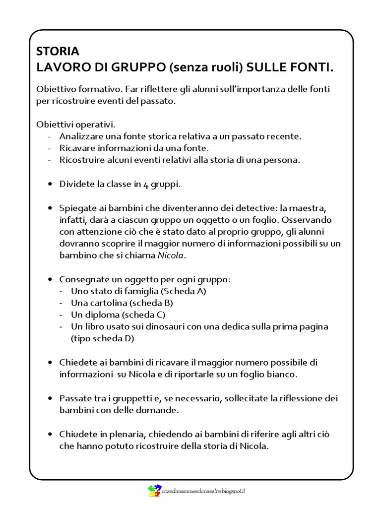 Obiettivo formativo. Far riflettere gli alunni sullimportanza delle fonti per ricostruire eventi del passato. Obiettivi operativi. - Analizzare una fonte storica relativa a un passato recente. - Ricavare informazioni da una fonte. - Ricostruire alcuni eventi relativi alla storia di una persona. Dividete la classe in 4 gruppi. Spiegate ai bambini che diventeranno dei detective: la maestra, infatti, dar a ciascun gruppo un oggetto o un foglio. Osservando con attenzione ci che stato dato al proprio gruppo, gli alunni dovranno scoprire il maggior numero di informazioni possibili su un bambino che si chiama Nicola. Consegnate un oggetto per ogni gruppo: - Uno stato di famiglia (Scheda A) - Una cartolina (scheda B) - Un diploma (scheda C) - Un libro usato sui dinosauri con una dedica sulla prima pagina (tipo scheda D) Chiedete ai bambini di ricavare il maggior numero possibile di informazioni su Nicola e di riportarle su un foglio bianco. Passate tra i gruppetti e, se necessario, sollecitate la riflessione dei bambini con delle domande. Chiudete in plenaria, chiedendo ai bambini di riferire agli altri ci che hanno potuto ricostruire della storia di Nicola.