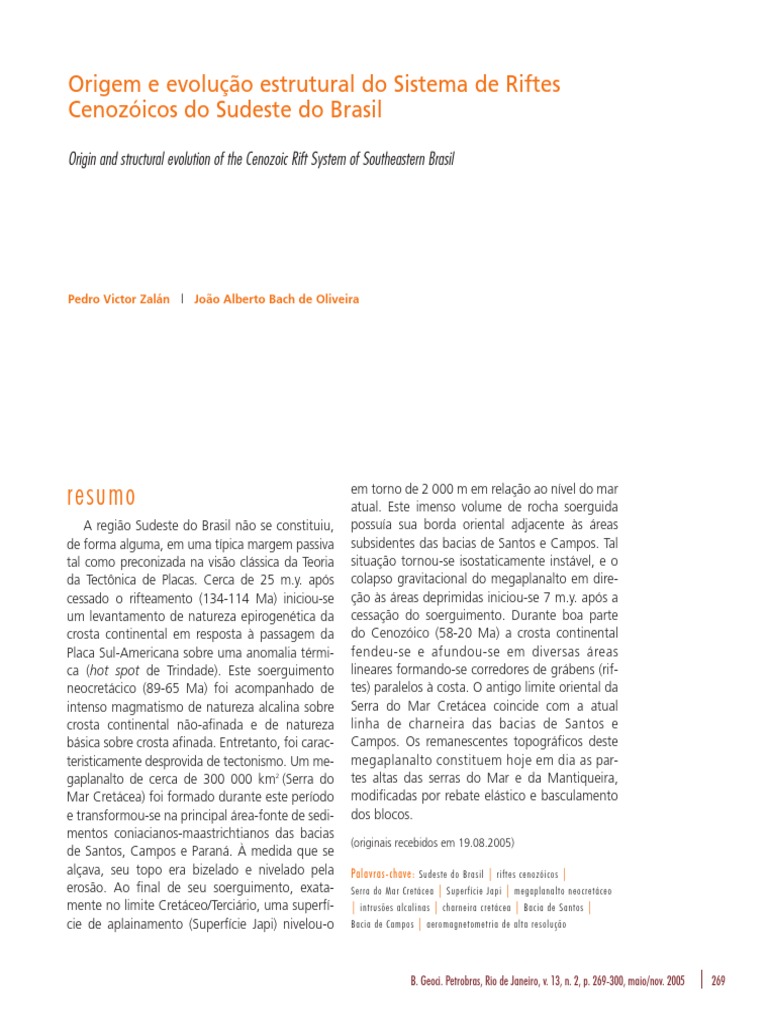 .A. A origem da Serra do Mar. Termocronolgia por traos de fisso em apatita. In: SIMPSIO NACIONAL DE ESTUDOS TECTNICOS, 9.; INTERNATIONAL SYMPOSIUM ON TECTONICS, 3., 2003, Bzios. Boletim de Resumos..., So Paulo: Sociedade Brasileira de Geologia, 2003. p. 384-385. HASUI, Y.; PONANO, W. L. Geossuturas e sismicidade no Brasil. In: CONGRESSO BRASILEIRO DE GEOLOGIA DE ENGENHARIA, 2., 1978, So Paulo. Anais... Rio de Janeiro: Associao Brasileira de. Geologia de Engenharia, 1978. v. 1, p. 331-338. HEILBRON, M.; SCHMITT, R. S.; MOHRIAK, W. U.; TROUW, R. A. J. Geology of the Cabo Frio region, Rio de Janeiro State, Brazil. In: INTERNATIONAL GEOLOGICAL CONGRESS, 31., 2000, Rio de Janeiro. [Anais] Rio de Janeiro: Academia Brasileira de Cincias, 2000. During-Cong. Field Trip Dft 06, 45 p. HEILBRON, M.; PEDROSA-SOARES, A. C.; CAMPOS NETO, M. C.; SILVA, L. C.; TROUW, R. A. J.; JANASI, V. A. Provncia Mantiqueira. In: MANTESSO-NETO, V., BARTORELLI, A., CARNEIRO, C. D. R., BRITO-NEVES, B. B. (Eds.). Geologia do Continente Sul-Americano: Evoluo da Obra de Fernando Flvio Marques de Almeida. So Paulo: Beca Produes Culturais Ltda., 2004. p. 203-234. HIRUMA, S.T.; RICCOMINI, C.; MODENESI-GAUTTIERI, M. C. Neotectnica no planalto de Campos de Jordo, SP. Revista Brasileira de Geocincias, So Paulo, v. 31, n. 3, p. 375-384, 2001. INSTITUTO DE PESQUISAS TECNOLGICAS DO ESTADO DE SO PAULO S.A. Mapa Geolgico do Estado de So Paulo. So Paulo, 1981. 1 mapa. Escala 1:500.000. KARNER, G. D. Rifts of the Campos and Santos Basins, Southeastern Brazil: Distribution and Timing. In: MELLO, M. R.; KATZ, B. J. (Eds.), Petroleum systems of South Atlantic Margins. Tulsa, Okla., American Association of Petroleum Geologists, 2000. p. 301-315 (American Association of Petroleum Geologists. Memoir, 73). LOURENS, L. J.; SLUIJS, A.; KROON, D.; ZACHOS, J. C.; THOMAS, E.; RHL, U.; BOWLES, J.; RAFFI, I. Astronomical pacing of late Palaeocene to early Eocene global warming events. Nature, London, v. 435, n. 23, p. 1083-1087, Jun. 2005.