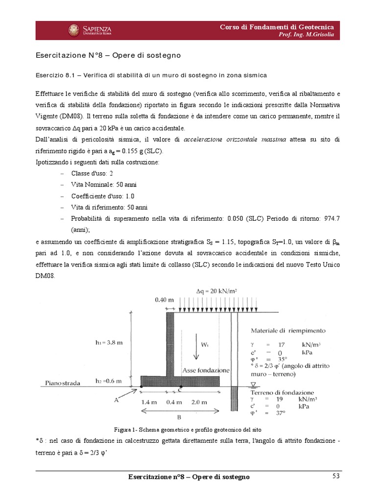 Effettuare le verifiche di stabilit del muro di sostegno (verifica allo scorrimento, verifica al ribaltamento e verifica di stabilit della fondazione) riportato in figura secondo le indicazioni prescritte dalla Normativa Vigente (DM08). Il terreno sulla soletta di fondazione da intendere come un carico permanente, mentre il sovraccarico q pari a 20 kPa un carico accidentale. Dallanalisi di pericolosit sismica, il valore di accelerazione orizzontale massima attesa su sito di riferimento rigido pari a ag = 0.155 g (SLC). Ipotizzando i seguenti dati sulla costruzione: Classe d'uso: 2 Vita Nominale: 50 anni Coefficiente d'uso: 1.0 Vita di riferimento: 50 anni Probabilit di superamento nella vita di riferimento: 0.050 (SLC) Periodo di ritorno: 974.7 (anni); e assumendo un coefficiente di amplificazione stratigrafica SS = 1.15, topografica ST=1.0, un valore di m pari ad 1.0, e non considerando lazione dovuta al sovraccarico accidentale in condizioni sismiche, effettuare la verifica sismica agli stati limite di collasso (SLC) secondo le indicazioni del nuovo Testo Unico DM08.